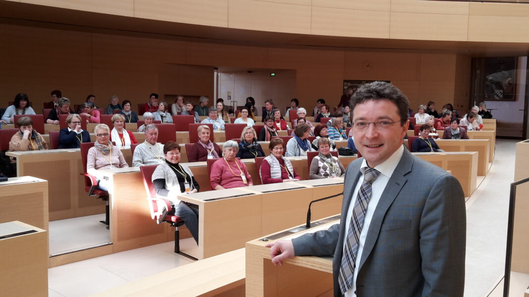 Nach der Stärkung der Besuchergruppe aus dem Bayerischen Wald gab es zunächst einmal zahlreiche Informationen zum Gebäude, zu den Aufgaben, zur Zusammensetzung und zur Arbeitsweise des bayerischen Parlaments vom Besucherdienst des Landtags. Anschließend stand der Höhepunkt der politischen Bildungsfahrt für die 100 Damen der Frauen-Union Freyung-Grafenau und Regen auf der Tagesordnung. Im Plenarsaal des Bayerischen Landtags konnten die Teilnehmerinnen an der Landtagsfahrt mit dem Abgeordneten Max Gibis eine volle Stunde lang diskutieren.