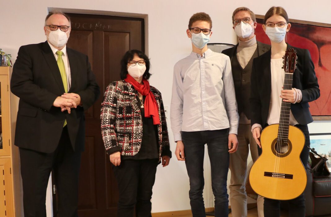 Passau. Es ist zu einer schönen Tradition geworden, dass Schülerinnen und Schüler des Auersperg-Gymnasiums Freudenhain kurz vor dem Fest einen musikalischen Weihnachtsgruß an Oberbürgermeister Jürgen Dupper überbringen. Diesmal waren die Gitarristin Johanna Keilhofer und der Akkordeonist Benedikt Sattler aus der Klasse 10a in Begleitung von Schulleiter Johannes Fuchs und Brigitte Glas (Betreuerin Fachschaft Musik) im Alten Rathaus zu Gast. Präsentiert wurden dabei weihnachtliche Weisen von „Adeste fideles“ bis „One More Christmas“ von Per-Olov Kindgren.