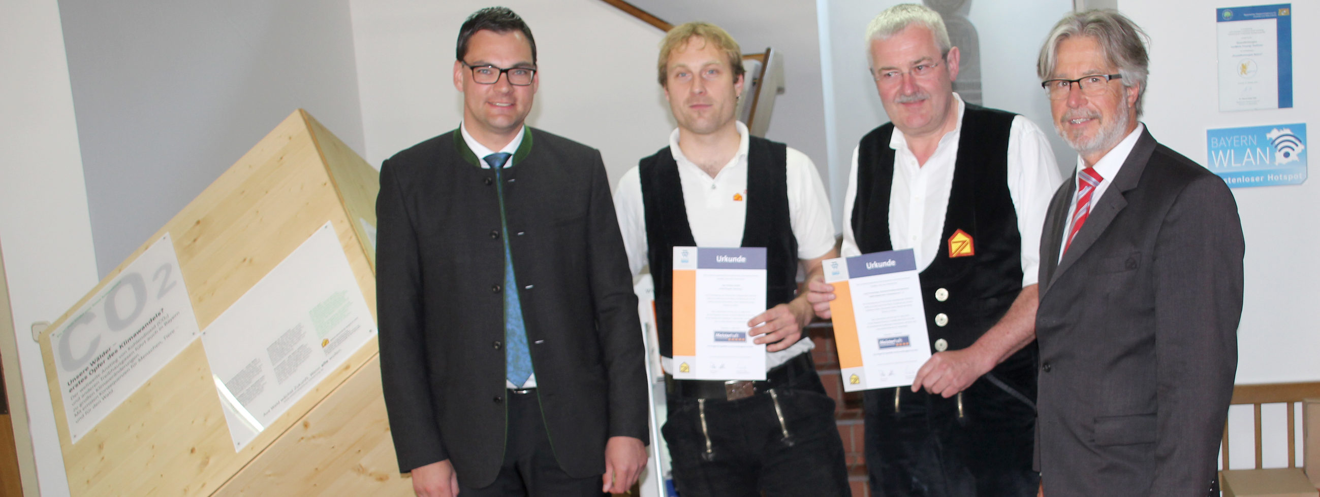 Der Hauptgeschäftsführer des Landesinnungsverbandes des bayerischen Zimmereihandwerks Alexander Habla konnte nun im Foyer des Landratsamtes in Freyung zwei Urkunden überreichen.