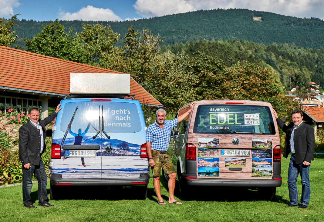 Für die nächsten fünf Jahre unterzeichneten die Bodenmaiser einen Werbevertrag mit dem Skigau, der ihnen die prominente Platzierung auf den viel genutzten Fahrzeugen sichert. “Näher können wir mit unserer Botschaft kaum an die Zielgruppe, nämlich die ambitionierten Sportler aus den besten Skigebieten Deutschlands und dem benachbarten Ausland, heran“, ist sich Bernhard Mosandl sicher. Während der Bus für die nordischen Skisportler mit Bildern vom Bretterschachten und der Bodenmaiser Ortsloipe beklebt ist, prangen am Heck des alpinen Transporters die neun Mitglieder der Bayerisch-Edel-Bodenmais Hotels. Emotionaler sind sicherlich die größeren Bilder, womit sie besser auf den weitläufigen Parkplätzen in den Langlauf- und Biathlonzentren zur Geltung kommen. “Der alpine Skibus steht dagegen meist in den großen Skisport-Orten in Deutschland, Österreich und der Schweiz,“ erklärt Max Gibis. Also genau da, wo Wellness-Hotels bestens aufgehoben sind.