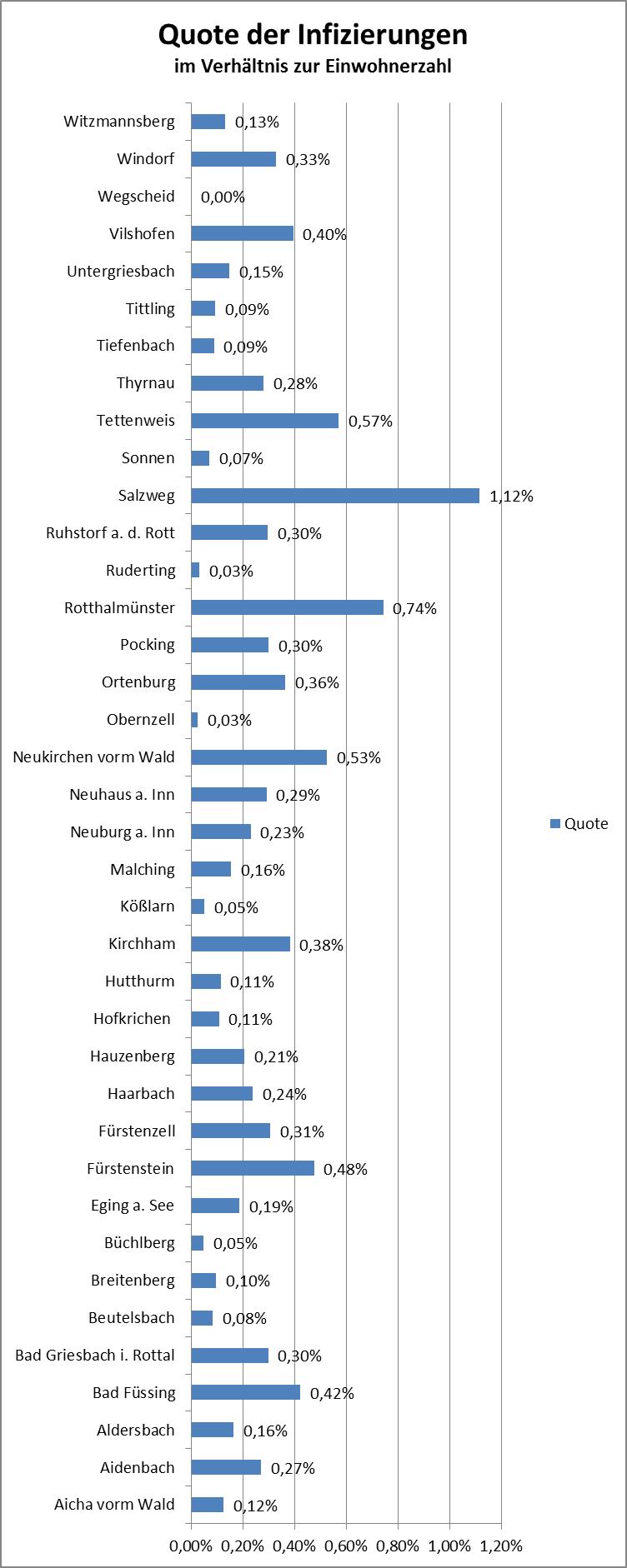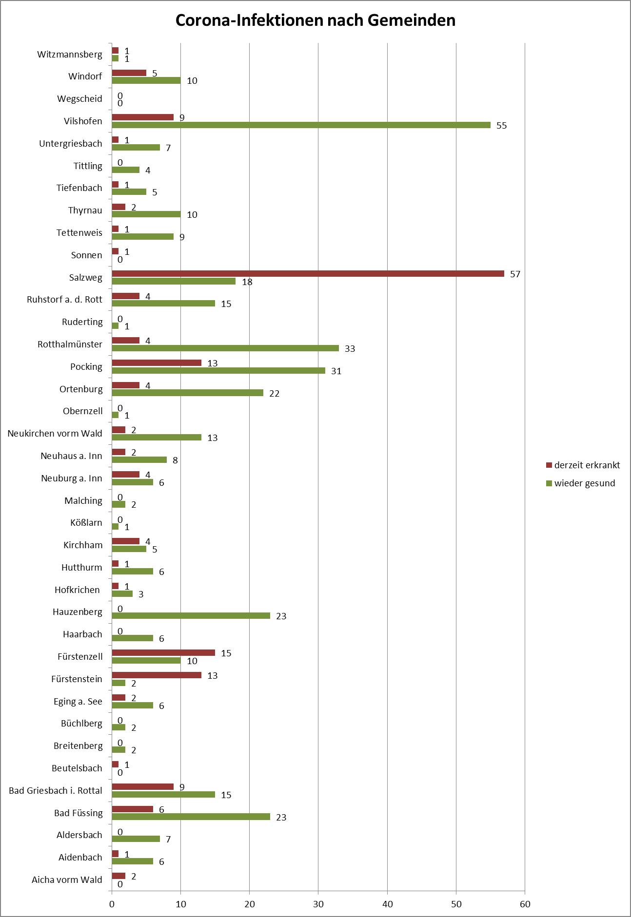 Hoffnungsvolle Zahlen zeigt im Wesentlichen auch der Blick auf die einzelnen Gemeinden, wobei statistische Aussagen aufgrund der zum Teil sehr niedrigen Fallzahlen schwierig sind. Nach Rücksprache mit dem Landesdatenschutzbeauftragten sieht das Landratsamt Passau künftig die Möglichkeit, nach Gemeinden aufgeschlüsselte Daten zu veröffentlichen. Angaben, die einzelne Einrichtungen oder gar Personenkreise betreffen, sind aus Gründen des Persönlichkeits- und Datenschutzes allerdings weiterhin nicht möglich.