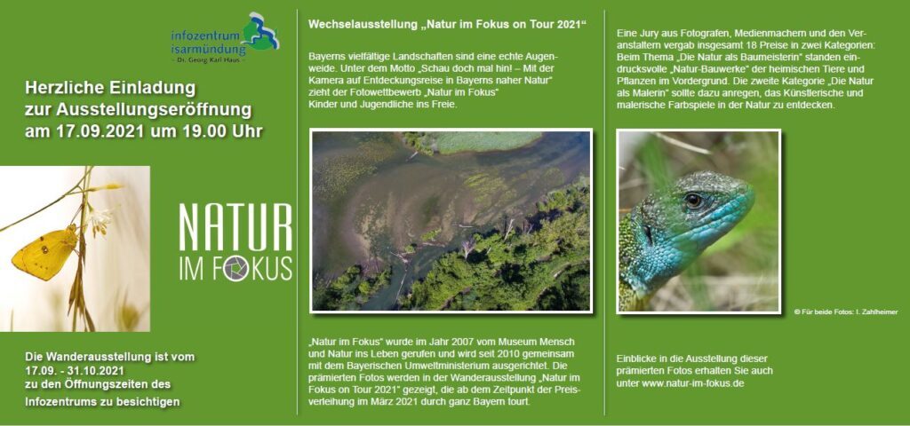Die prämierten Fotos werden in der Wanderausstellung „Natur im Fokus on Tour 2021“ gezeigt, die ab dem Zeitpunkt der Preisverleihung im März 2021 durch ganz Bayern tourt. Nähere Informationen zum Fotowettbewerb und zu den Ausstellungsterminen erfährt man unter www.natur-im-fokus.de.