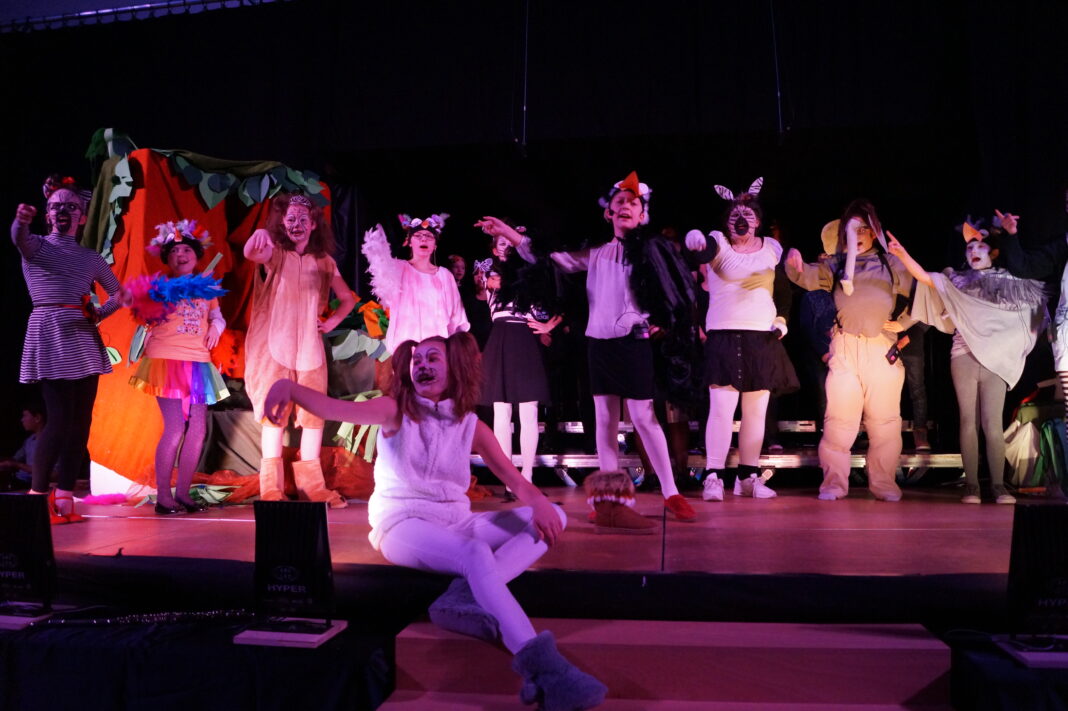 Dann entführte das Musical “Kwela Kwela“ das Publikum nach Afrika: Wegen einer großen Dürre wurde eine Konferenz der Tiere einberufen, bei der Tebogo, der Lärmvogel (putzig: Louisa Wagner mit ihrem Megaphon), alle Hände voll zu tun hat, das Chaos zu ordnen und die Krokodile am Auffressen der anderen Teilnehmer zu hindern. Jake, ein Zebra (herrlich zerstört: Rosalie Wilhelm), erzählte am Rande der Konferenz seinem Freund Fred (witzig gekringelt: Luisa Eder), dass er das “Große Orakel“ befragt habe, wie er bei seiner “Flamme“ Priscilla landen könnte. Dessen Tipp: Er solle sich mit einer Bratpfanne dreimal täglich an den Kopf schlagen. Dementsprechend zerbeult sah der arme Jake auch schon aus. Doch dann erscheint die “Löwen-Queen“ (wie die echte in England: Katrin Seidl) mit Gefolge, um über den Wassernotstand zu beraten. Die einzige Lösung: Das Orakel befragen. Es stellt sich heraus, dass das “Große Orakel“ ein alter Stiefel eines weißen Jägers ist, den die Löwen aufgefressen haben. Aber der Stiefel kann sprechen – auch wenn er (siehe Jake) momentan nicht ganz zurechnungsfähig erscheint. Der weise Marabu (Hannah Waschinger) singt die Beschwörungsformel und das Stiefel-Orakel gibt den (erstaunlich vernünftigen) Tipp, nach Wasser zu graben. Doch Tschipo, der Buschhase (Sophia Schuh), will nicht mitgraben, da er seine Hände als Musiker fürs Flötenspielen braucht. Als endlich Wasser sprudelt, können alle Tiere endlich trinken, nur Tschipo bekommt nichts, also geht er protestierend.