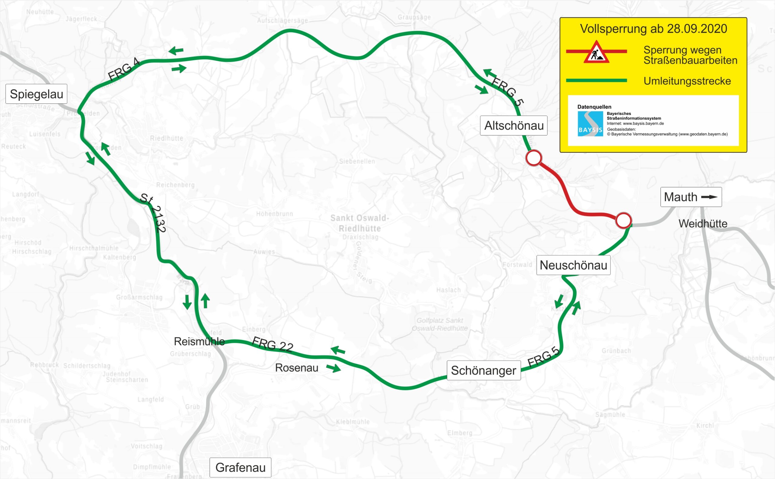 Der Verkehr aus Richtung Mauth wird in dieser Zeit ab dem Nationalparkzentrum Lusen auf der FRG 5 über Neuschönau und Schönanger umgeleitet. Ab Rosenau verläuft die Umleitung über die FRG 22 bis zum Gewerbegebiet Reismühle, von dort über die St 2132 bis nach Spiegelau und dort über die FRG 4 und FRG 5 bis nach Altschönau. In der Gegenrichtung verläuft die Umleitung analog.