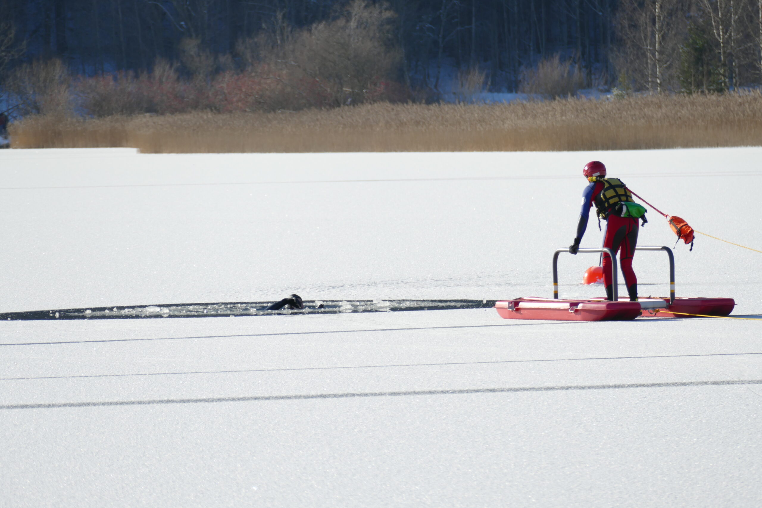 - Nur mit Hilfe von Hilfsmitteln wie Rettungsring, Leitern (teilweise an Seen am Uferbereich vorhanden), Ästen, Abschleppseil oder ähnliche Gegenstände, die zur Verfügung stehen, die eingebrochene Person absichern.