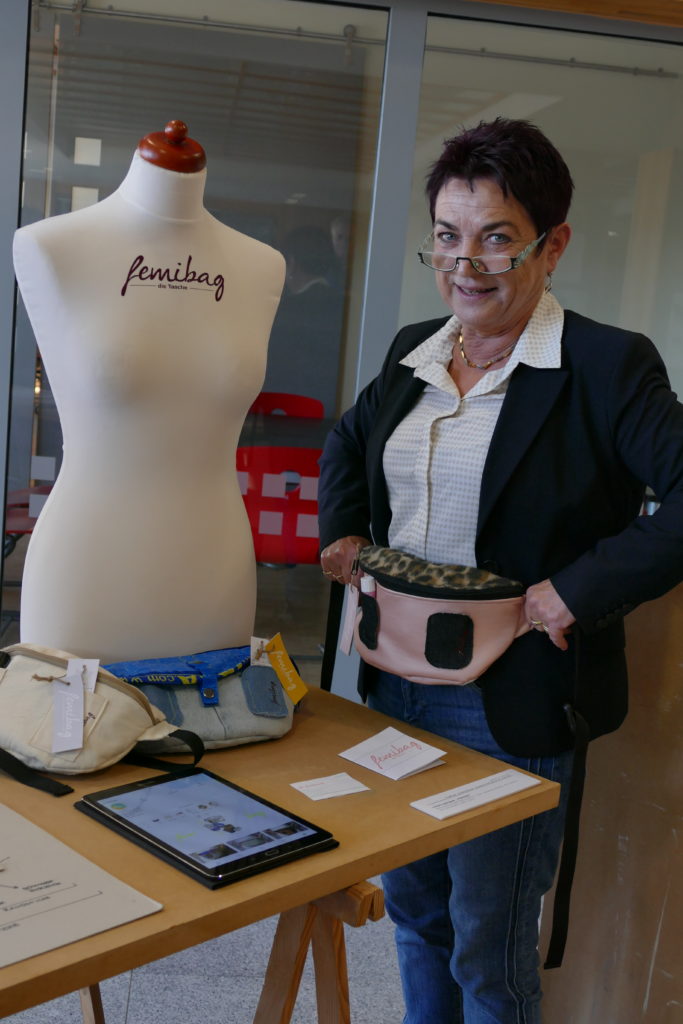 Anschließend gehörte die Bühne erneut der Referentin eines Projekt-Seminars. Lena Gibis präsentierte die Ergebnisse aus dem Fachbereich Kunst. Unter der Leitung von Franz Häuslmeier schlüpften neun Schüler in die Rolle von jungen Produktdesignern. Dabei entstanden durchaus alltagstaugliche Produkte, wie „femibag“, eine Bauchtasche mit Wärmepads, Spiegel und mobilem Akku, zur Lösung der täglichen Probleme einer Frau. Aber nicht nur für die Frauenwelt wurden Produkte entwickelt, auch die Männer kamen auf ihre Kosten. Das Designerteam „EAT“ gestaltete einen mobilen Grill aus Holz und Beton für spontane, ortsungebundene, gemeinsame Grillabende – wobei einer der externen Partner, FA. Pauli (Ringelai), einen exklusiven Bratrost ausfertigte. Auch die sportliche Komponente kam nicht zu kurz: Das Team „SKTBX“ entwickelte eine mobile Skaterrampe für all die Skater, die nicht in der Nähe eines Skateparks wohnen.