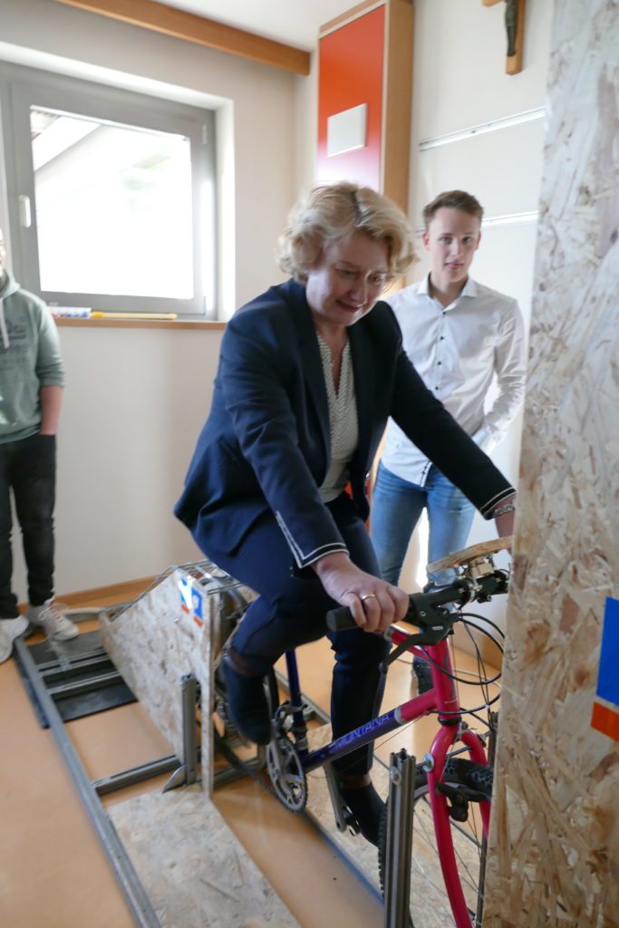 Das Fach Physik hingegen arbeitete wieder praxisorientiert. Samira Zeinhofer und Johannes Hainzte erläuterten die Ergebnisse des P-Seminars „Physik phänomenal“ (Leitung: Josef Müller). Die Schülerinnen und Schüler dieses Seminars machten schier unmögliche Dinge möglich. Sie veränderten beispielsweise die physikalischen Eigenschaften von Sand in der Art, dass dieser flüssig wurde, oder machten eine Seifenblase begehbar. Auch an Umweltschutz wurde gedacht: Die Pedalkraft eines Fahrrads dient der Stromerzeugung, der wiederum für das Aufladen des Handyakkus benutzt werden kann.