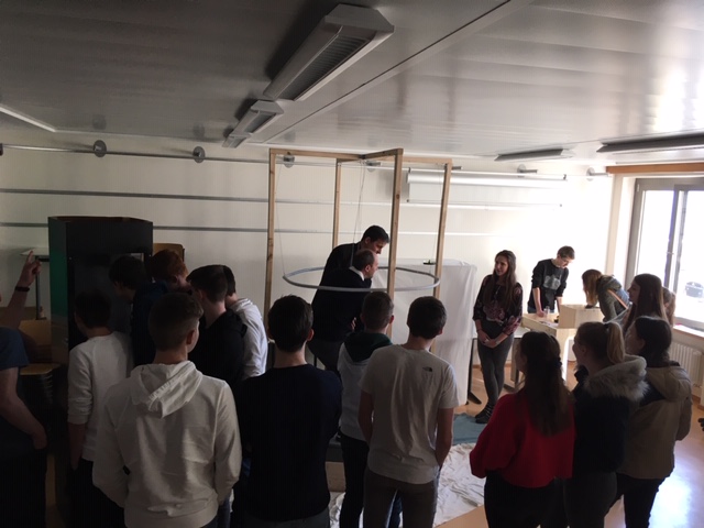 In der anschließenden Pause wurden die Produkte und Entwicklungen der angehenden Abiturienten im Eingangsbereich des Gymnasiums und im flexiblen Klassenzimmer ausgestellt. Die Neugier der Besucher war groß und viele versuchten sich selbst an den Erfindungen. Die Begeisterung der Gäste für die Leistungen der Schüler und die von ihnen entwickelten Produkte zeigte vor allem das Scheitern, die Pause auf lediglich zehn Minuten zu beschränken, da die Besucher die Ausstellungsflächen nur ungern verließen.