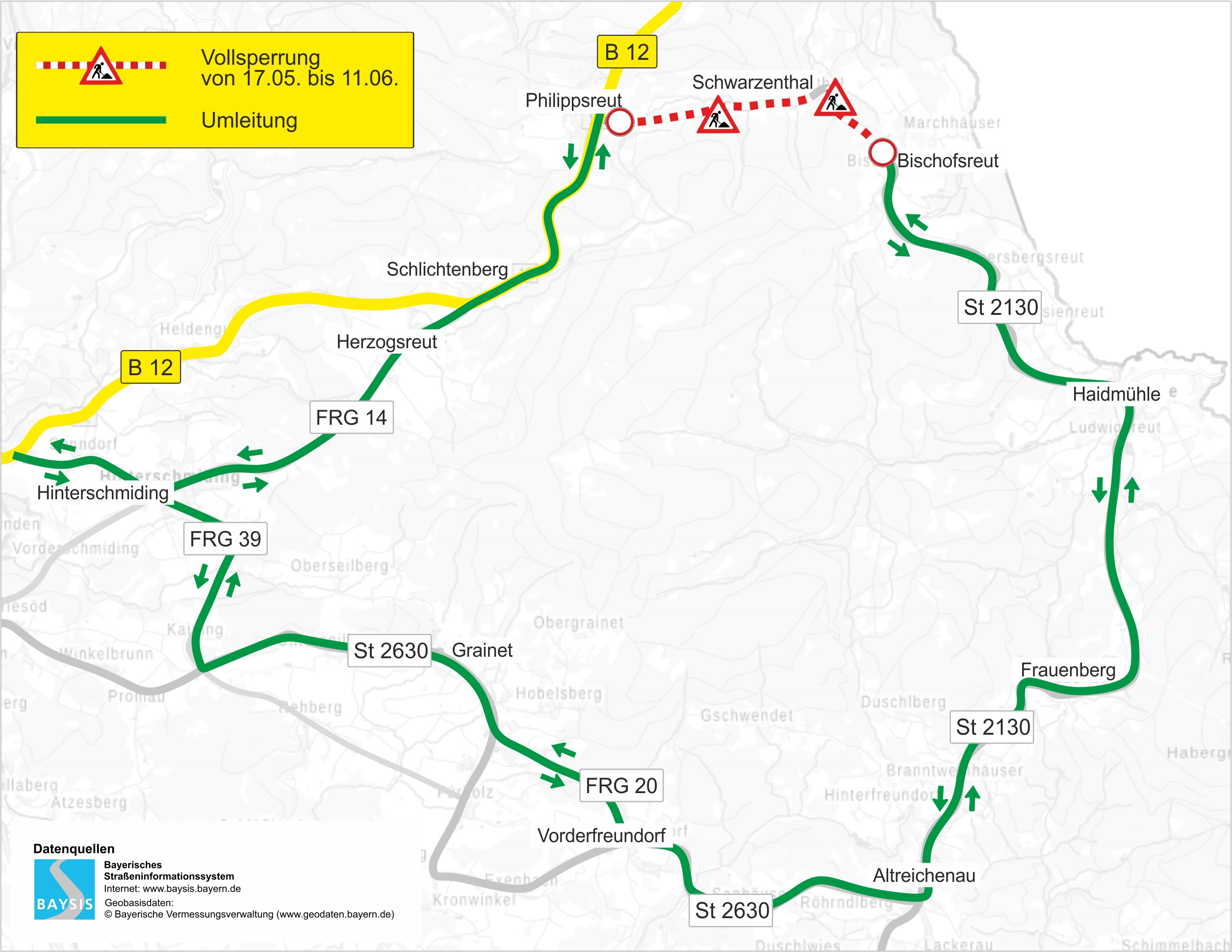 Der Verkehr aus Richtung Philippsreut mit Zielrichtung Bischofsreut wird auf der B 12 bis Schlichtenberg geleitet, von dort auf der FRG 14 weiter bis zur Kreuzung mit der FRG 39 bei Hinterschmiding und weiter bis zur St 2630. Von dort verläuft die Umleitung bis zur Kreuzung mit der FRG 20 bei Vorderfreundorf und weiter zur Kreuzung mit der St 2130 sowie anschließend über die Orte Altreichenau, Haidmühle und schließlich nach Bischofsreut.