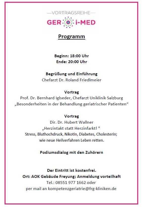 In der neuen Vortragsreihe GER-iMED referieren zukünftig regelmäßig angesehene TOP-Mediziner vor Ort über Themen aus dem Bereich der Geriatrie in allgemeiner verständlicher Sprache.