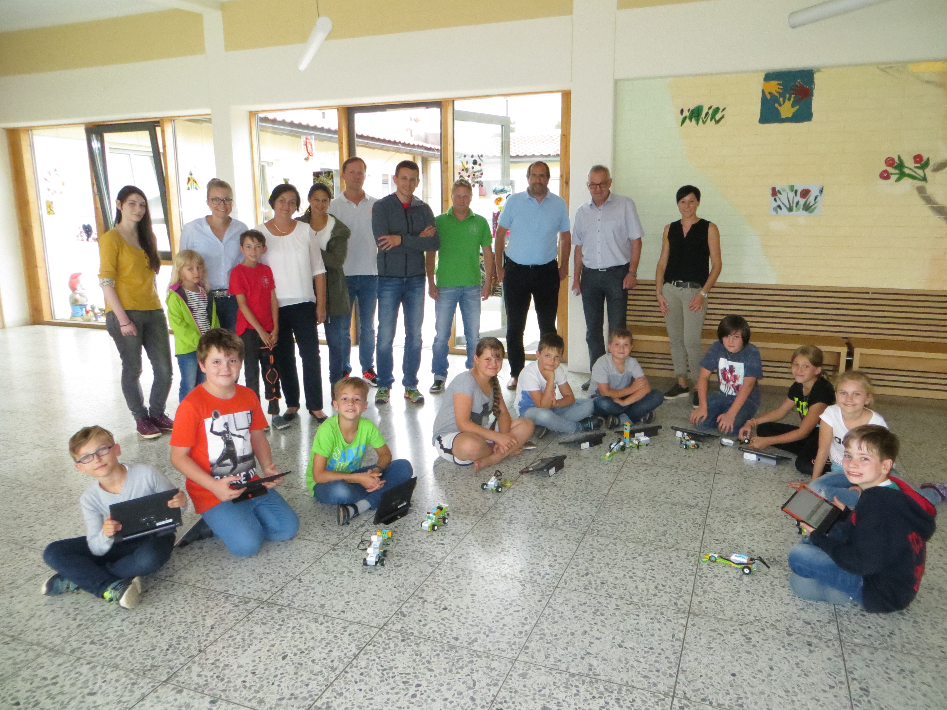 Die Kinder der Offenen Ganztagsschule durften bereits mit den Baukästen und den dazugehörigen Lenovo-Tablets experimentieren. „Es sieht vielleicht ganz einfach aus, wenn die kleinen Fahrzeuge vorwärts und rückwärts fahren oder ihre Ladungen abkippen zu lassen, aber bis man da hinkommt, muss ein Kind schon viel leisten!“ betonte Rektor Manfred Gibis, der die Sponsoren zu einem Informationsnachmittag an die Schule eingeladen hatte.