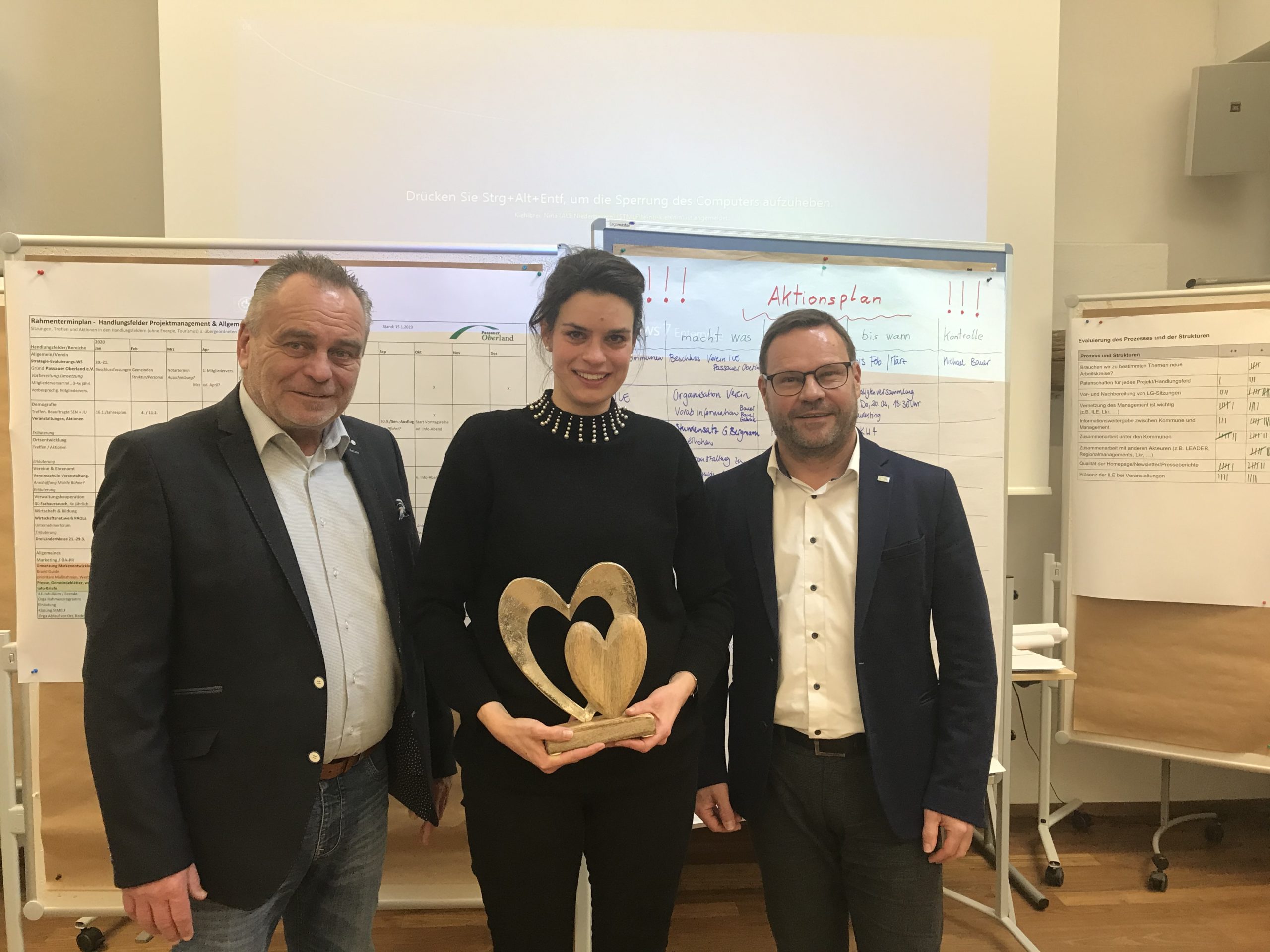Der Abschluss dieses Auftakt-Workshop stand leider unter dem Zeichen des „Abschiednehmens“. Nina Kiehlbrei wird als Projektbetreuerin seitens des ALE zum 1.3.2020 ausscheiden. Sie wurde zurück nach München, in ihre Heimatstadt, berufen und wird künftig für die ILE-Allianzen bayernweit im Bereich Zentrale Angelegenhei-ten der Ländlichen Entwicklung (BZA) tätig sein. Zum Abschied bedankten sich die beiden ILE-Vorsitzenden Bürgermeister Stephan Gawlik und sein Kollege Walter Bauer bei Nina Kiehlbrei für ihre wertvolle fachliche Unterstützung in den letzten vier Jahren und ihre Offenheit für die Belange der ILE Passauer Oberland mit einem Präsent.