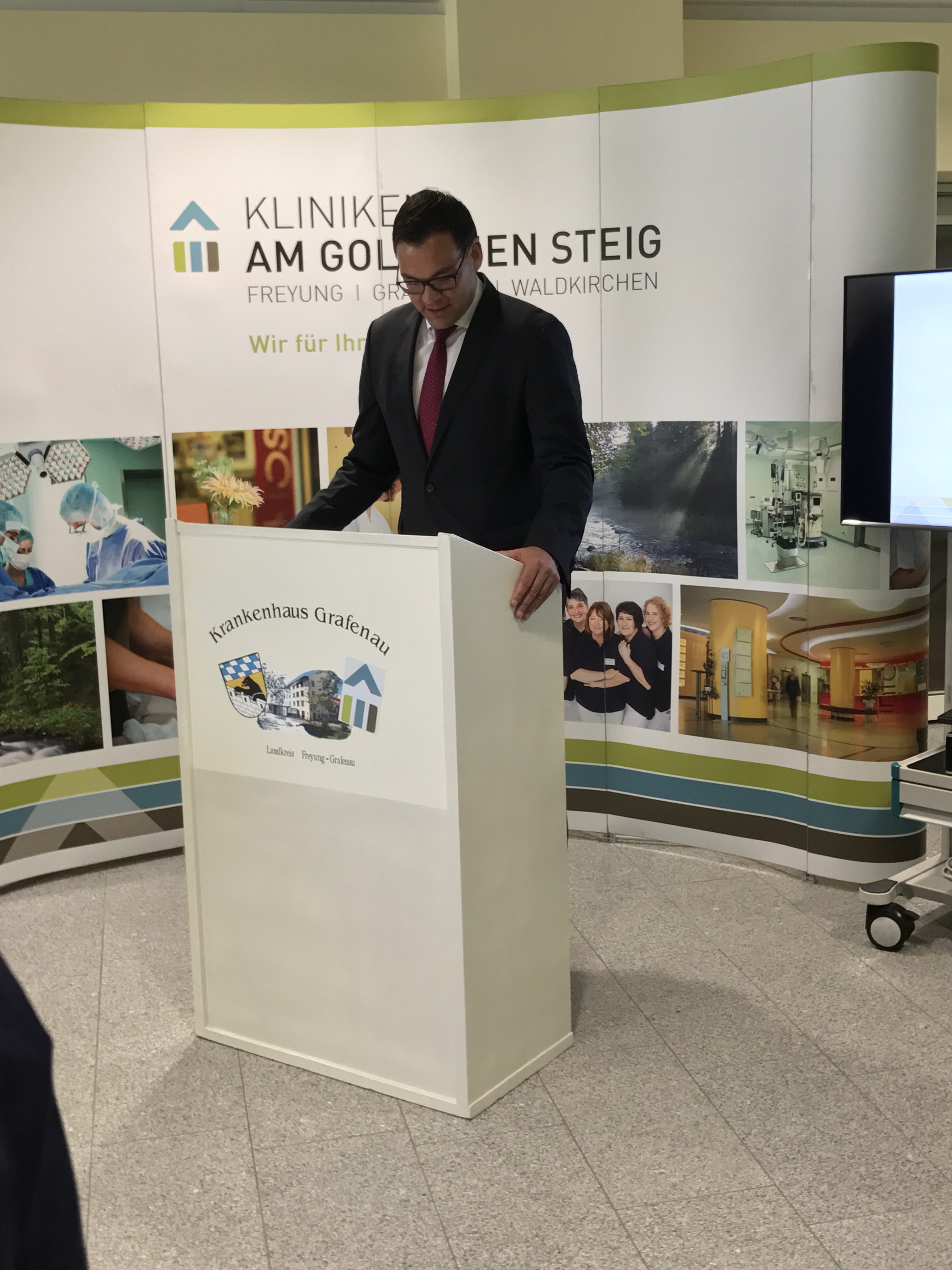 Landrat und Aufsichtsratsvorsitzender der Kliniken Am Goldenen Steig Sebastian Gruber eröffnete den Informations- sowie Festakt und dankte allen Anwesehnden für ihr Erscheinen; so auch den Herren Alexander Muthmann und Max Gibis in ihrern Fuktionen als Landtagsabgeordnete des Freistaats sowie des Kreistags Freyung-Grafenau.