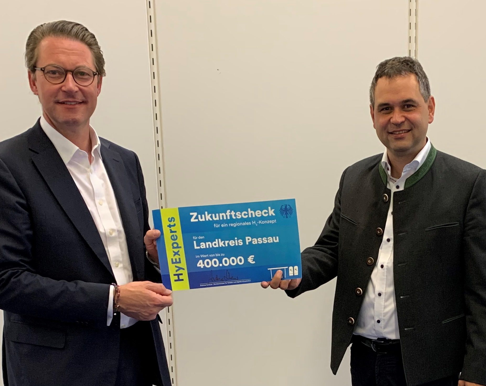 Bundesminister Andreas Scheuer übergab den „Zukunftscheck“ jetzt persönlich an Landrat Raimund Kneidinger. Der Landkreis hatte in der Kategorie „HyExperts“ zusammen mit 14 weiteren Gebietskörperschaften aus ganz Deutschland die überzeugendsten Bedingungen für den Aufbau einer regionalen Wasserstoffwirtschaft präsentiert. Mit dem Fördergeld, so Minister Scheuer bei der Scheckübergabe, könne der Landkreis nun weitere Beratungs-, Planungs- und Dienstleistungen zur Erstellung eines umsetzungsfähigen Gesamtkonzepts beauftragen.