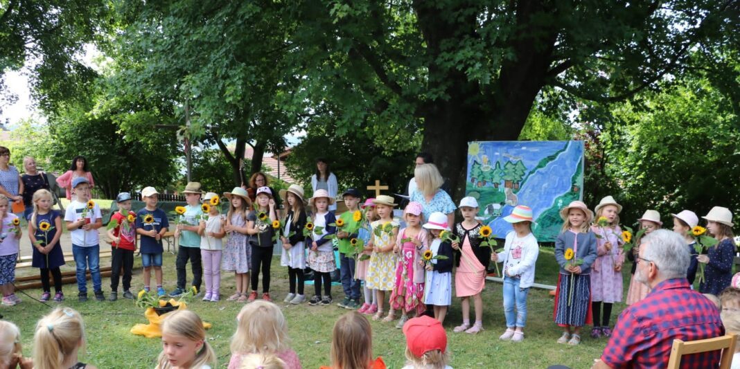 „Sei behütet“ – das Thema der religiösen Feierstunde richtete sich aber nicht nur an die künftigen Schülerinnen und Schüler, sondern an alle Mädchen und Buben des Hinterschmidinger Kindergartens. Denn es geht nun in die wohlverdienten Ferien. Wichtig dabei: Verschiedenste Kopfbedeckungen – zum Schutz vor der Sonne, der Fahrradhelm, der Reiterhelm. Diese stellen die Schulanfängerinnen und -anfänger im Rahmen der Messe, die von Pater Biju zelebriert wurde, vor.