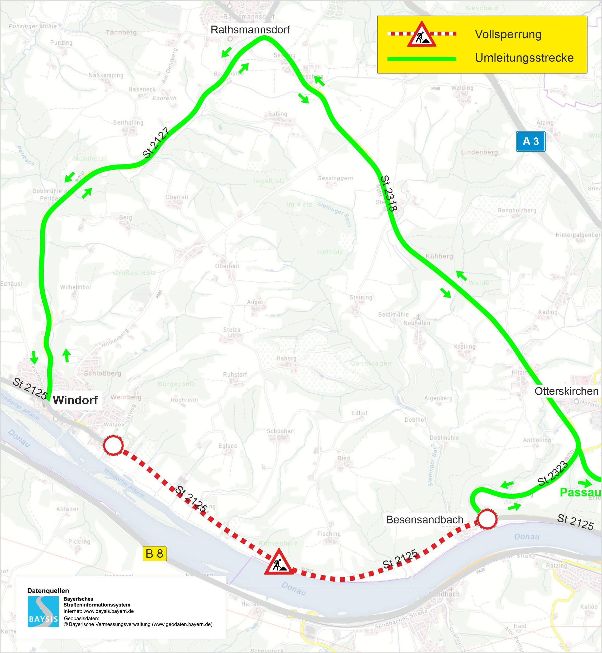 Um die Sicherheit der Verkehrsteilnehmer sowie der Arbeiter und eine qualitativ hochwertige Ausführung zu gewährleisten, finden die Hauptarbeiten voraussichtlich bis Mitte August unter Vollsperrung statt. Restarbeiten dauern dann noch bis zum 27. August 2021. Während der Vollsperrung wird der Verkehr von Windorf über Rathsmannsdorf und Otterskirchen zur Stampfinger Kreuzung (St 2318/St 2323) geleitet, von dort geht es entweder geradeaus weiter in Richtung Passau oder nach rechts in Richtung Besensandbach bis zum dortigen Bauende.