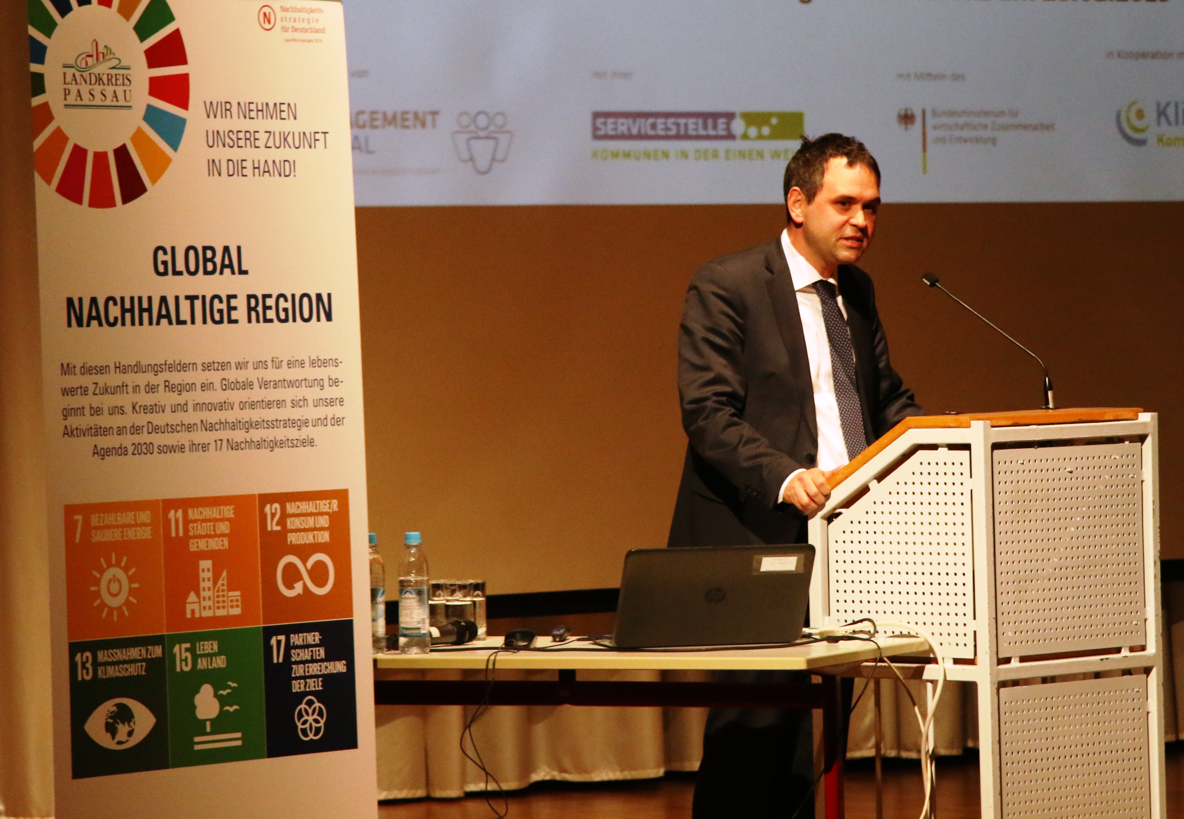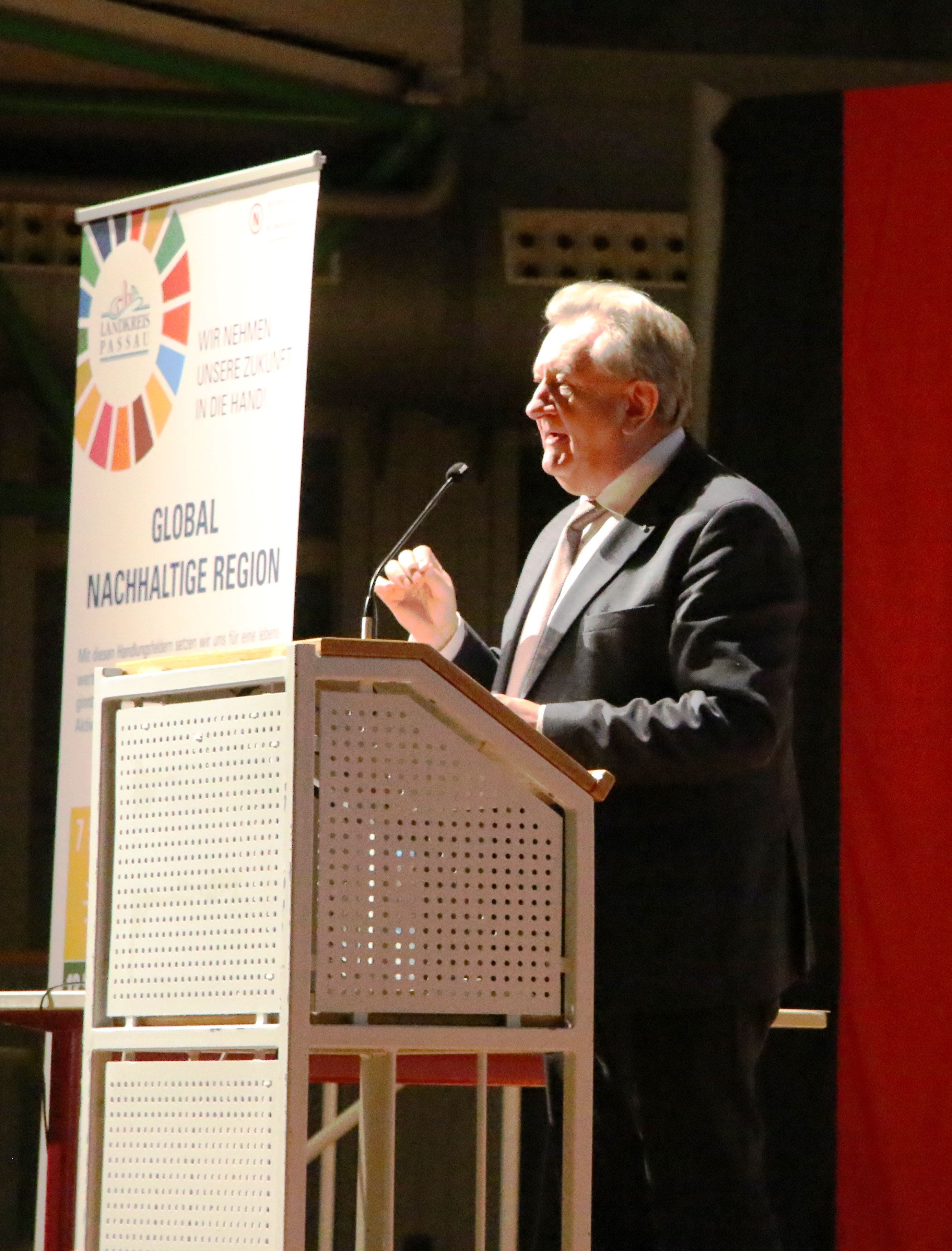 Der ehemalige bayerische Umweltminister Dr. Marcel Huber, der als Gastredner eingeladen war, spannte einen Bogen weit zurück auf die Wortgeschichte der Nachhaltigkeit. Diese gehe zurück auf Hans Carl von Carlowitz, der sich schon um 1713 mit einer „nachhaltenden“ Waldbewirtschaftung beschäftigte. Die Nachhaltigkeit habe demnach entgegen der heute vorwiegenden öffentlichen Wahrnehmung ihren Ursprung weniger in der Ökologie als in der Ökonomie. Tatsächlich sei es aber heute eine der größten Herausforderungen, ein Gleichgewicht zwischen Umweltschutz und wirtschaftlichem Wachstum zu schaffen. Und, so Huber weiter: „Wir müssen die Ziele aus der Agenda 2030 der Vereinten Nationen so übersetzen, dass wir sie auf kommunaler Ebene realistisch umsetzen können.“ Mit Blick auf Entwicklungshilfe und dem Projekt „1000 Schulen für unsere Welt“, mit dem auch der Landkreis Passau die Schulbildung der Menschen in Afrika verbessern und damit den Fluchtursachen entgegenwirken will, zitierte Dr. Marcel Huber den ehemaligen amerikanischen Präsidenten John F. Kennedy: „Es gibt nur eins, was auf Dauer teurer ist als Bildung: keine Bildung.“ Beim täglichen Handeln nicht nur auf kommunaler Ebene sollten sich Entscheidungsträger die Fragen stellen „Ist das wirklich nachhaltig? Hat diese Entscheidung Auswirkungen – vielleicht sogar negative – auf die Zukunft?“ Diesen Rat gab Huber den Konferenzteilnehmern mit auf den Weg. Das sei schon ein großer Schritt in Richtung global nachhaltige Region.