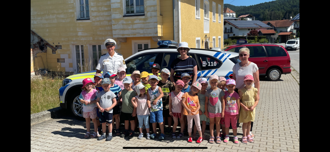 Karlsbach / Waldkirchen. Polizeihauptmeisterin Raffaela Scheuplein von der Polizeistation Waldkirchen besuchte vor einigen Tagen die Kinder im Karlsbacher Kindergarten. Nach der Brotzeit nahm die Rasselbande das mitgebrachte Polizeieinsatzfahrzeug genau unter die Lupe. Dabei konnten sie sehr viele interessante Sachen finden, unter anderem die faltbaren Pylonen und die Warnwesten gefielen den Kids sehr.