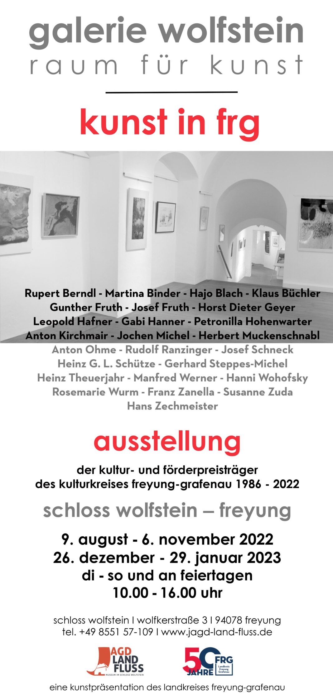 Freyung. Im Schloss Wolfstein befindet sich neben dem Museum Jagd Land Fluss auch die landkreiseigene Kunstgalerie – die Galerie Wolfstein. Diese zeigt aktuell und anlässlich des 50-jährigen Bestehens des Landkreis Freyung-Grafenau eine sehr bemerkenswerte Ausstellung über alle Künstlerinnen und Künstler, die mit dem Kultur- und Förderpreis des Kulturkreises Freyung-Grafenau ausgezeichnet wurden.