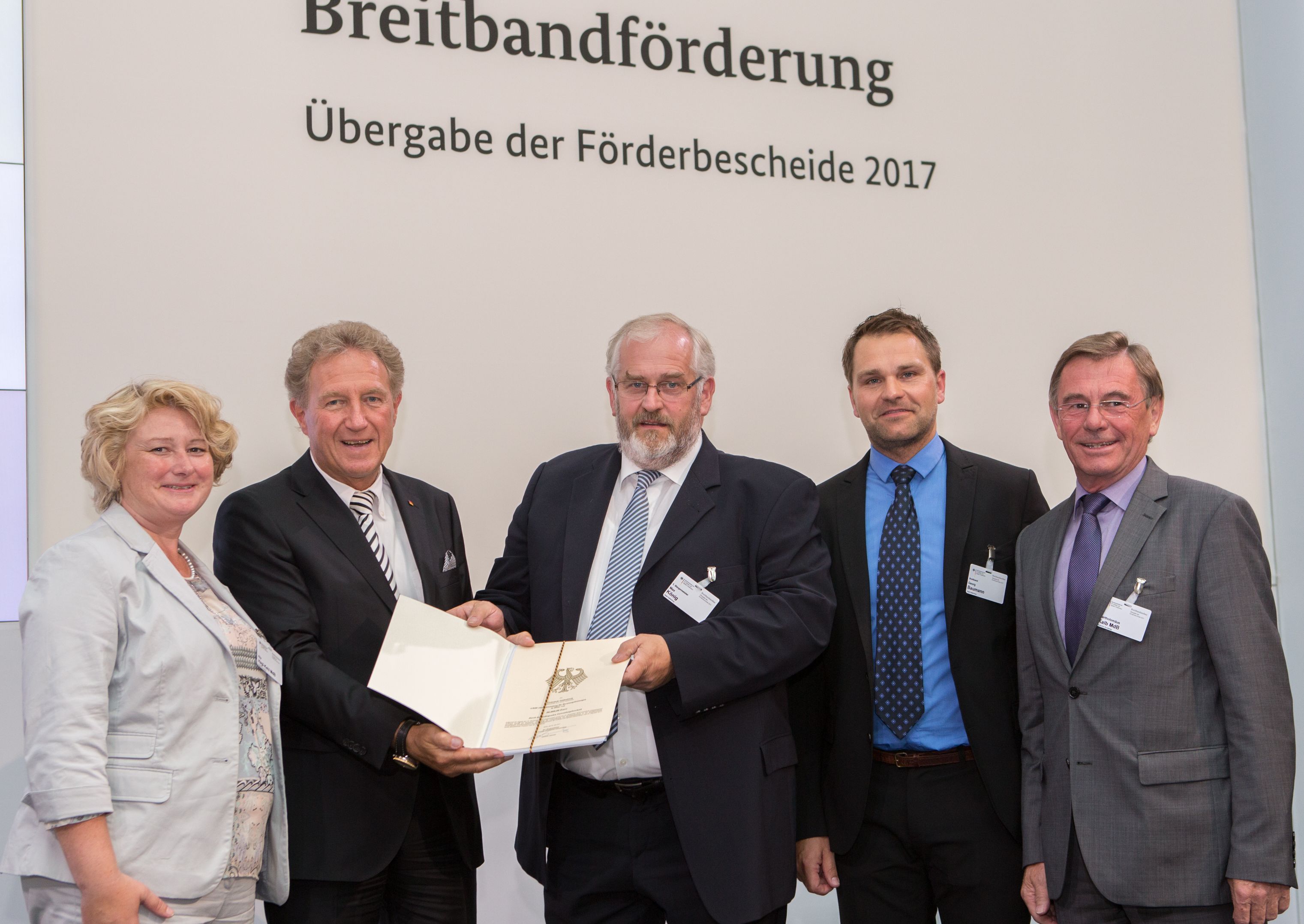 Berlin/Freyung-Grafenau, 5. Juli 2017. Saldenburg hat vomBund eineMittelzusage in Höhe von 50.000 Euro für den Ausbau des schnellen Internets imGemeindegebiet erhalten. Zur Übergabe des Förderbescheids kamen der erste Bürgermeister der Gemeinde Saldenburg Max König und der „Breitband-Pate“ der Gemeinde, Georg Bachmann in der letzten Juniwoche nach Berlin ins Bundesverkehrsministerium. Die beiden Abgeordneten Rita Hagl-Kehl und Bartholomäus Kalb, die Deggendorf und Freyung-Grafenau im Bundestag vertreten, gratulierten zum Erhalt der Förderung. Verwendet werden können die Mittel für Untersuchungen, wie sich die weißen Flecken bei der Breitband-Versorgung am besten beseitigen lassen und Geschwindigkeiten von mindestens 50 Mbit/s pro Haushalt realisiert werden können. Mit bis zu 15 Millionen Euro je Gemeinde können im Rahmen des Bundesprogramms dann auch Bauleistungen gefördert werden.