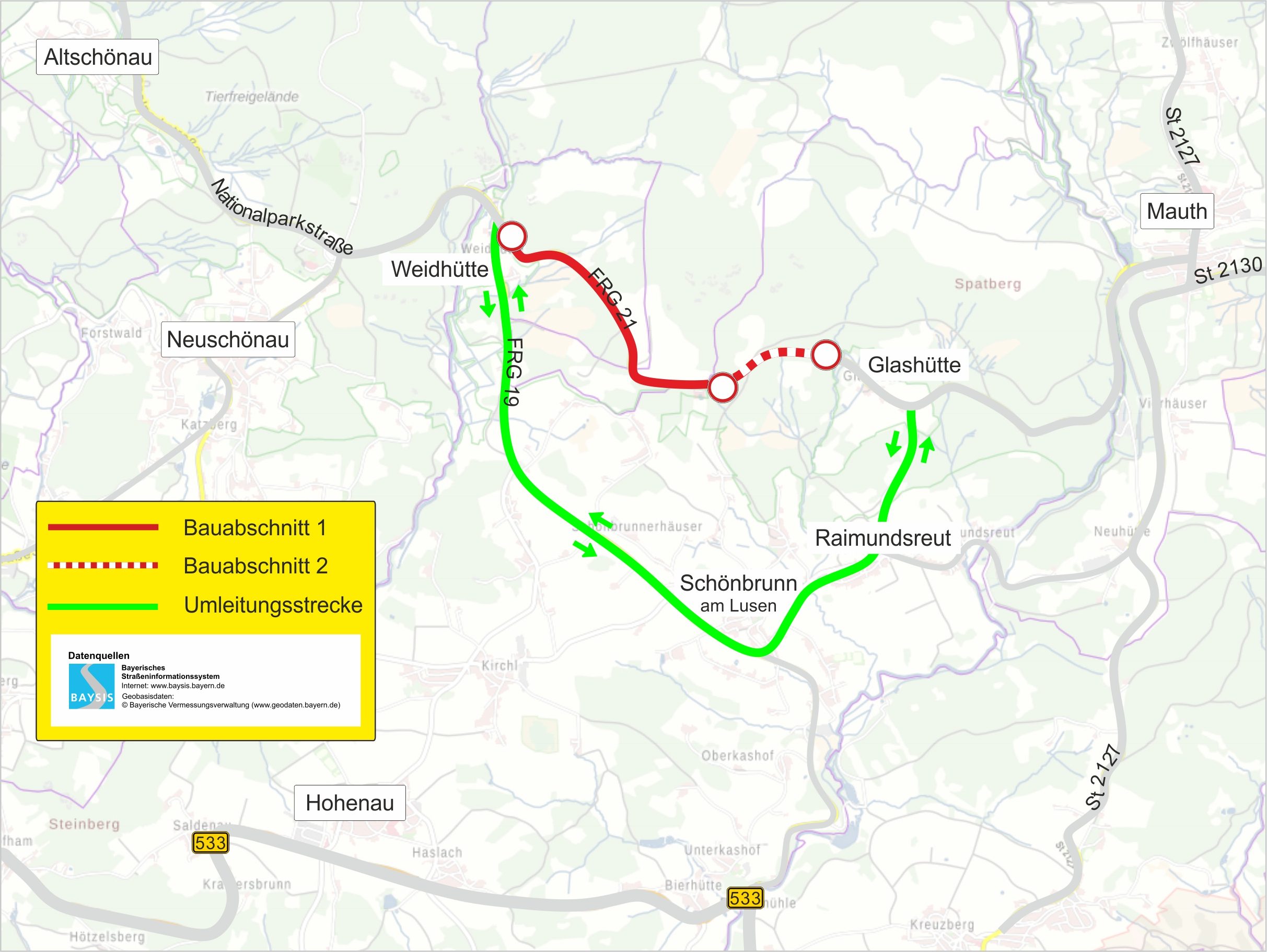 Für die Arbeiten ist eine Vollsperrung erforderlich. Damit das Jugendwaldheim (Wesselyhaus) immer aus einer Richtung erreichbar bleibt, wird die Maßnahme in zwei Bauabschnitte aufgeteilt. Der Verkehr wird von Glashütte kommend über Raimundsreut und Schönbrunn am Lusen in Richtung Waldhütte umgeleitet, in der Gegenrichtung verläuft die Umleitung analog.