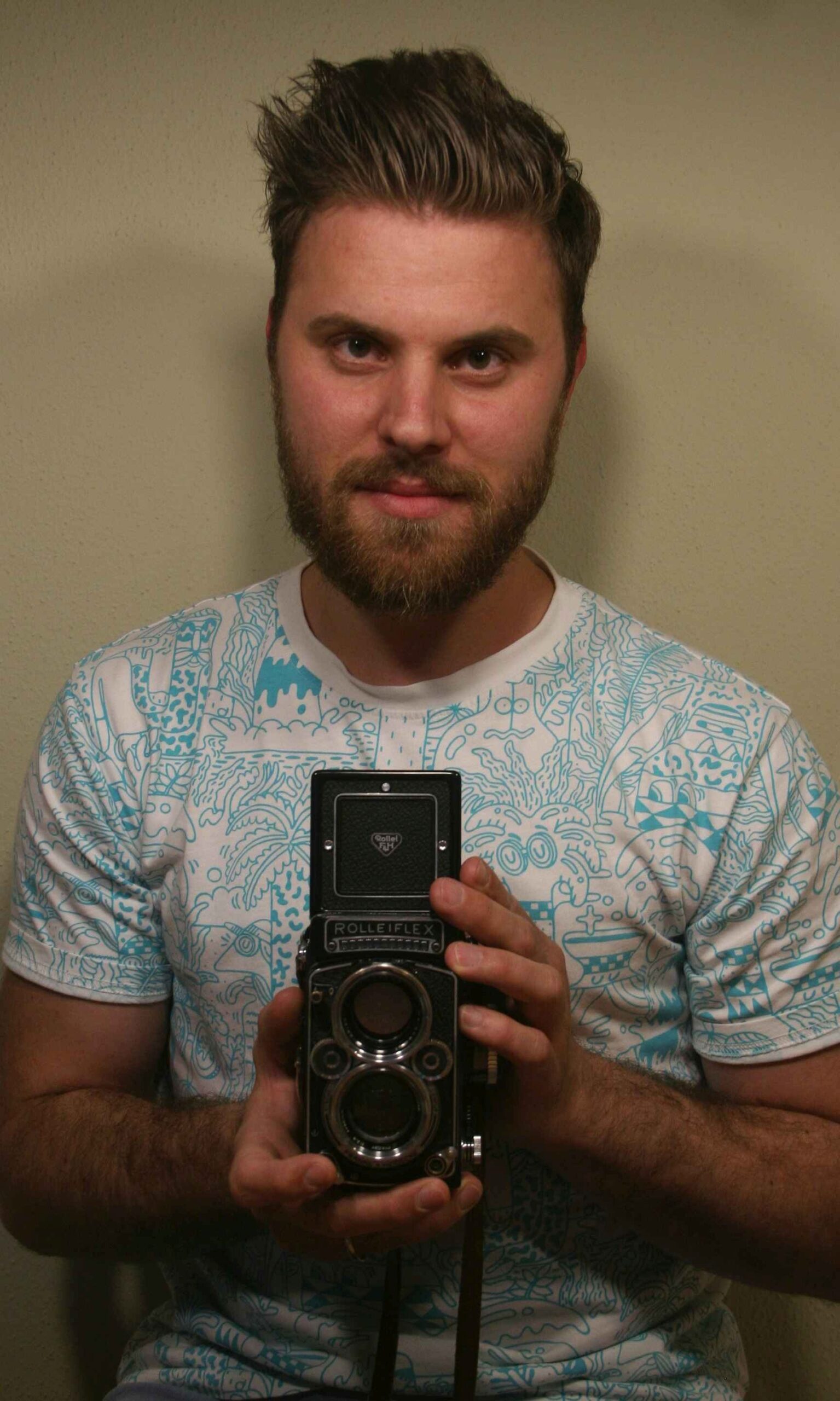 Natürlich ist da immer noch die Geschichte von jenem Mittzwanziger, der eines Tages die Wand seines alten Kinderzimmers mit schwarzer Tafelfarbe anstrich, Scheinwerfer davor platzierte und aus diesem „Atelier“ heraus begann, seine Umwelt mittels Portraits, Aktaufnahmen und auch dem einen oder anderen skurrilen Stilleben fotografisch zu erschließen. Doch sie tritt in den Hintergrund. Martin Waldbauer sattelte 2014 auf Analogfotografie um, beschaffte sich zwei Mittelformatkameras sowie eine Großformatkamera (deren Negativgröße entspricht etwa einem DIN A4-Blatt!); es blieb beim konsequenten Schwarzweiß, der bevorzugten halbtotalen oder halbnahen Einstellung und dem Naturlicht, doch das Interpretieren „lernte er quasi von der Pieke auf neu im Selbststudium“.