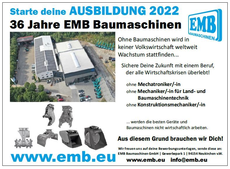 Bewerbungsunterlagen per Email an info@emb.eu oder per Post an EMB Baumaschinen GmbH, Gewerbepark 1, 94154 Neukirchen vorm Wald