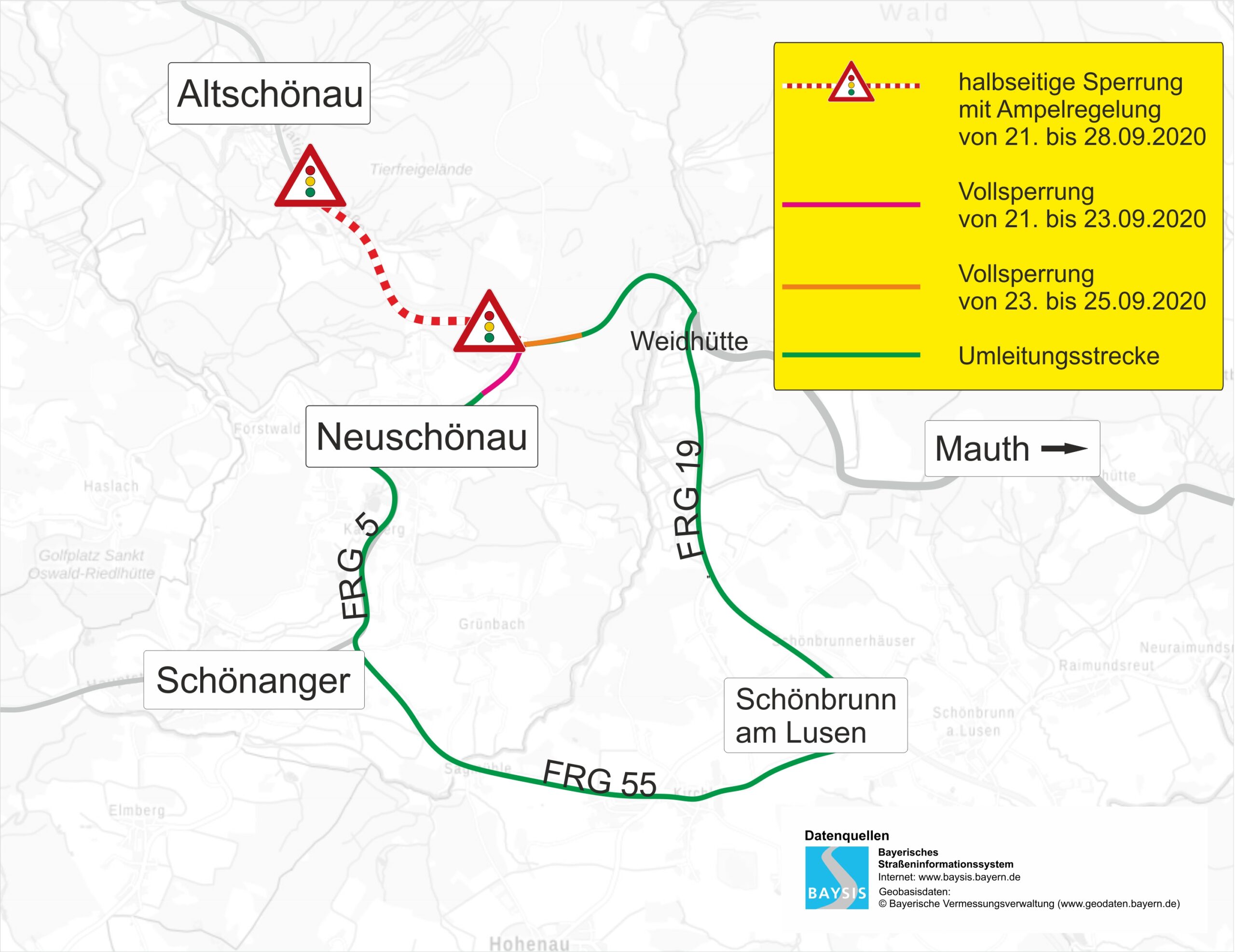 Der Verkehr aus Richtung Mauth wird in dieser Zeit ab dem Nationalparkzentrum Lusen auf der FRG 5 über Neuschönau und Schönanger umgeleitet. Bei Rosenau verläuft die Umleitung über die FRG 22 bis zum Gewerbegebiet Reismühle, von dort über die St 2132 bis nach Spiegelau und dort über die FRG 4 bis nach Altschönau. In der Gegenrichtung verläuft die Umleitung analog.