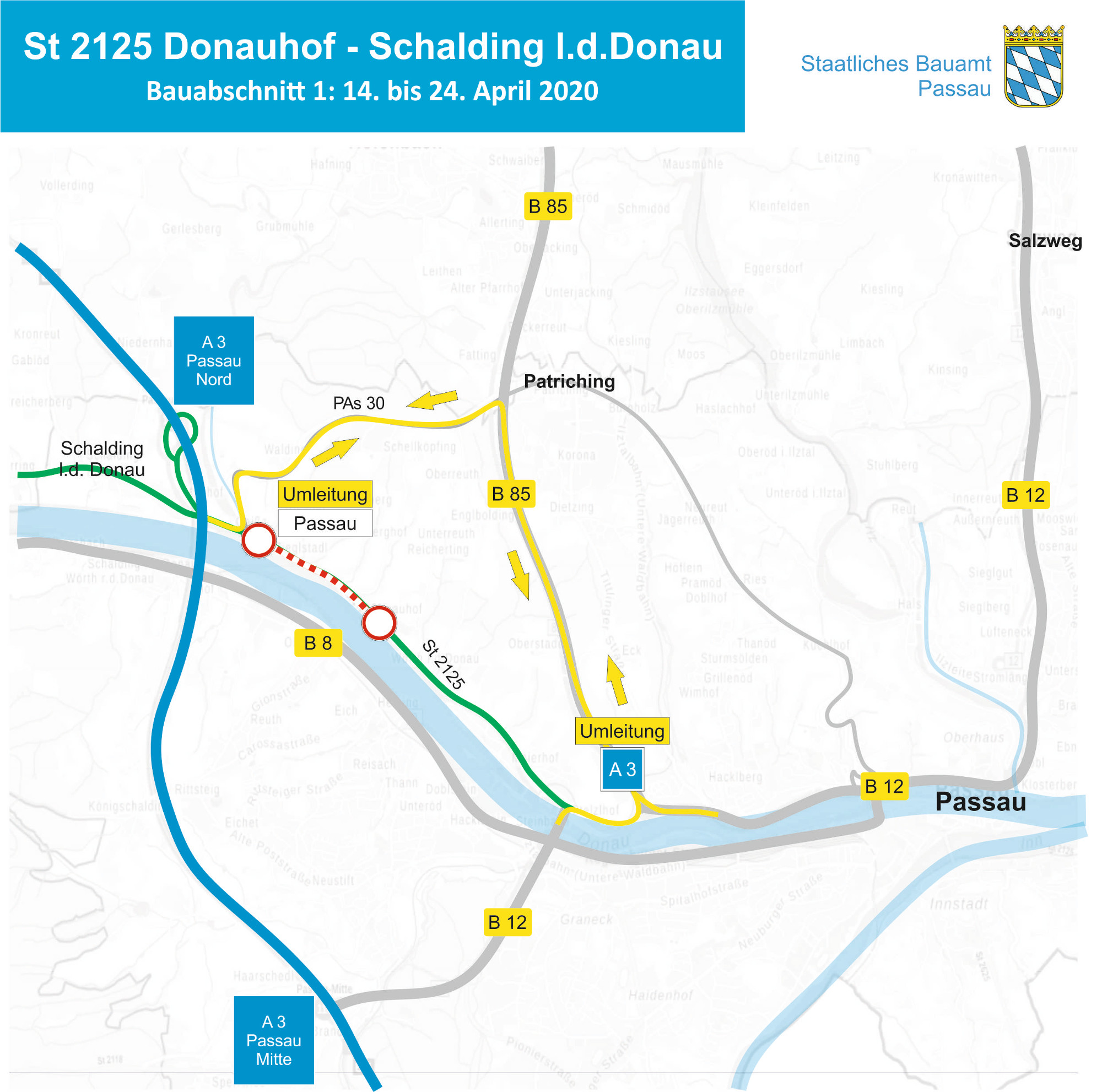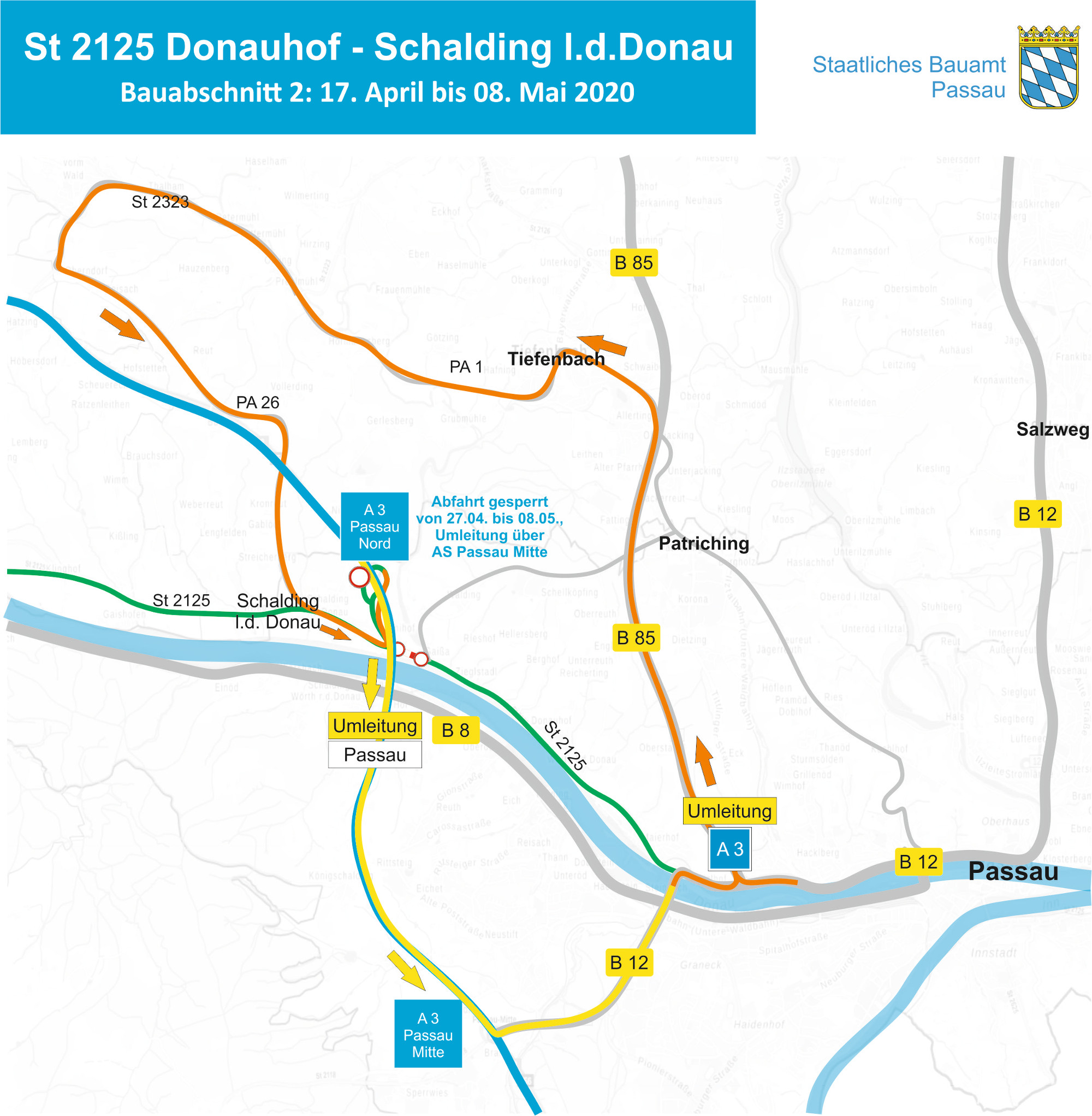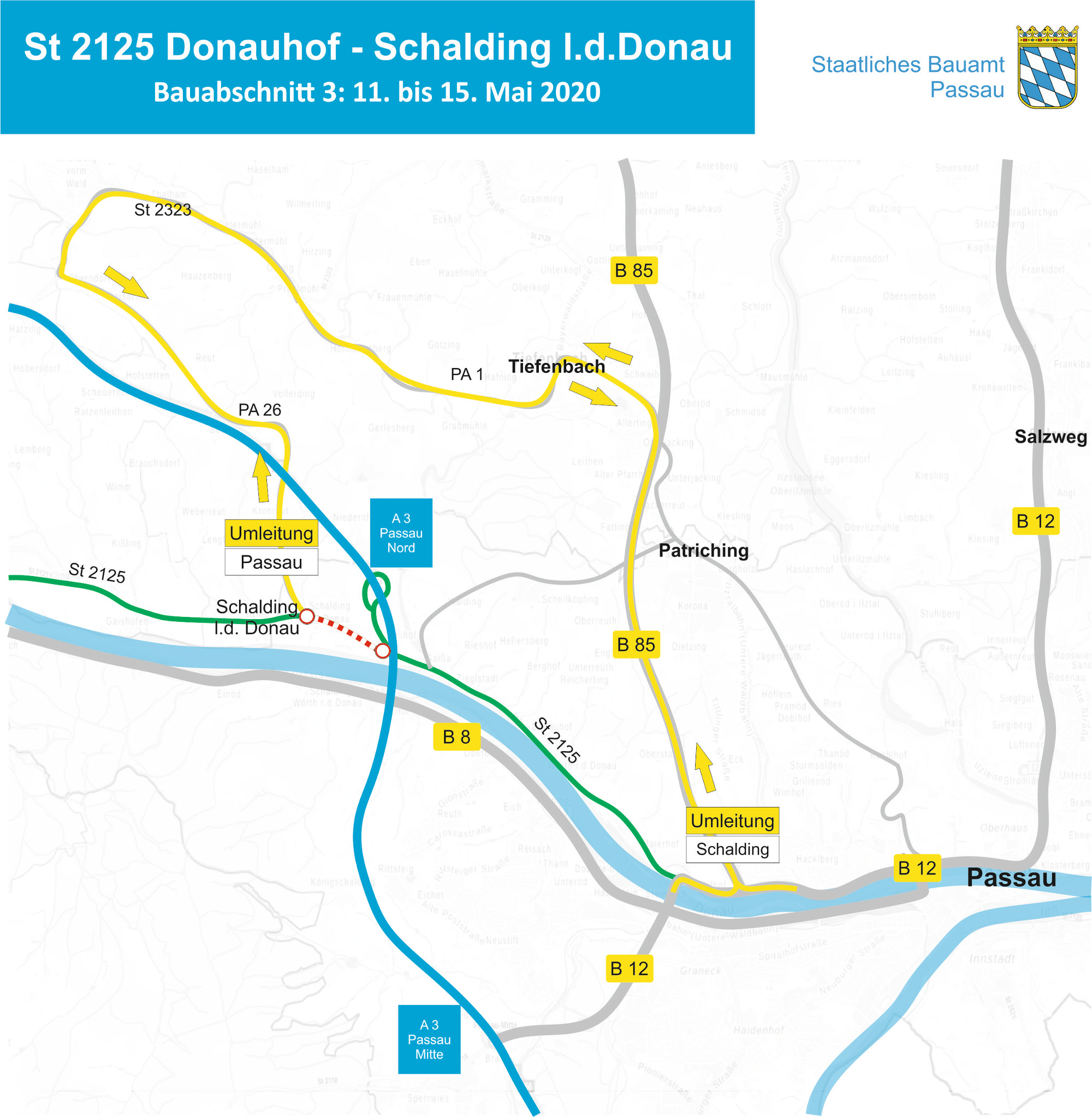 Bauabschnitt 3 – Einmündung Schalding bis Schalding l.d.Donau – 11. bis 15.05.2020Der auf der St 2125 in Richtung Passau fahrende Verkehr wird in Schalding l.d.Donau auf die PA 26 umgeleitet. Die Umleitung verläuft weiter auf der St 2323 bis zur Kreuzung mit der PA 1 und von dort zur B 85 bei Oberjacking weiter in Richtung Passau. In der Gegenrichtung verläuft die Umleitung analog.