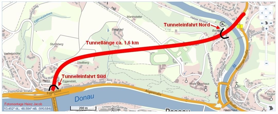 (Bild: Die geplante Tunnelstrecke würde an der B12 Nord bei der Reischlkuve beginnen, über eine Brücke in den eigentlichen Tunnel und dann, unter Umgehung von Ilzstadt und Anger, bis zur Schanzlbrücke führen)