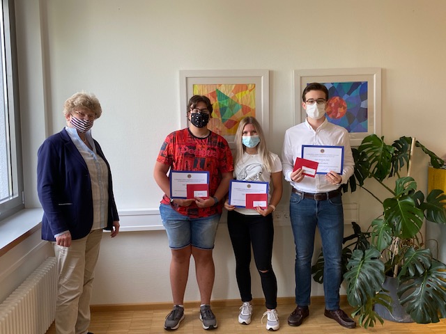 Schulleiterin Barbara Zethner überreichte den drei Schülern ihre Auszeichnung heuer ohne Publikum: Geehrt wurden Maximilian Alberth (Q11), Felix Binder (10a) und Lisa Pauli (Q11). Alle drei sind als KSJ-Mitglieder in der Jugendarbeit aktiv und bemühen sich als Tutoren bzw. Mentoren um die jüngeren Schüler am Gymnasium, denen sie das ganze Schuljahr über als Motivatoren, Ansprechpartner oder einfach nur als Vorbilder zur Seite stehen.