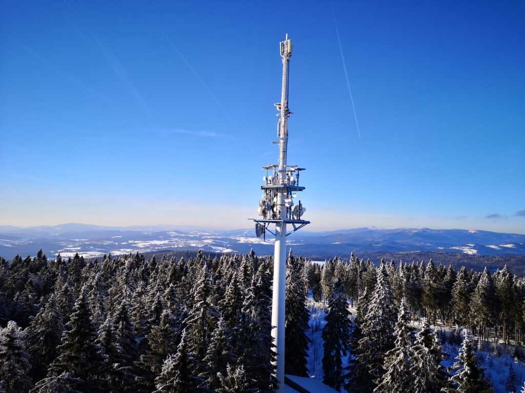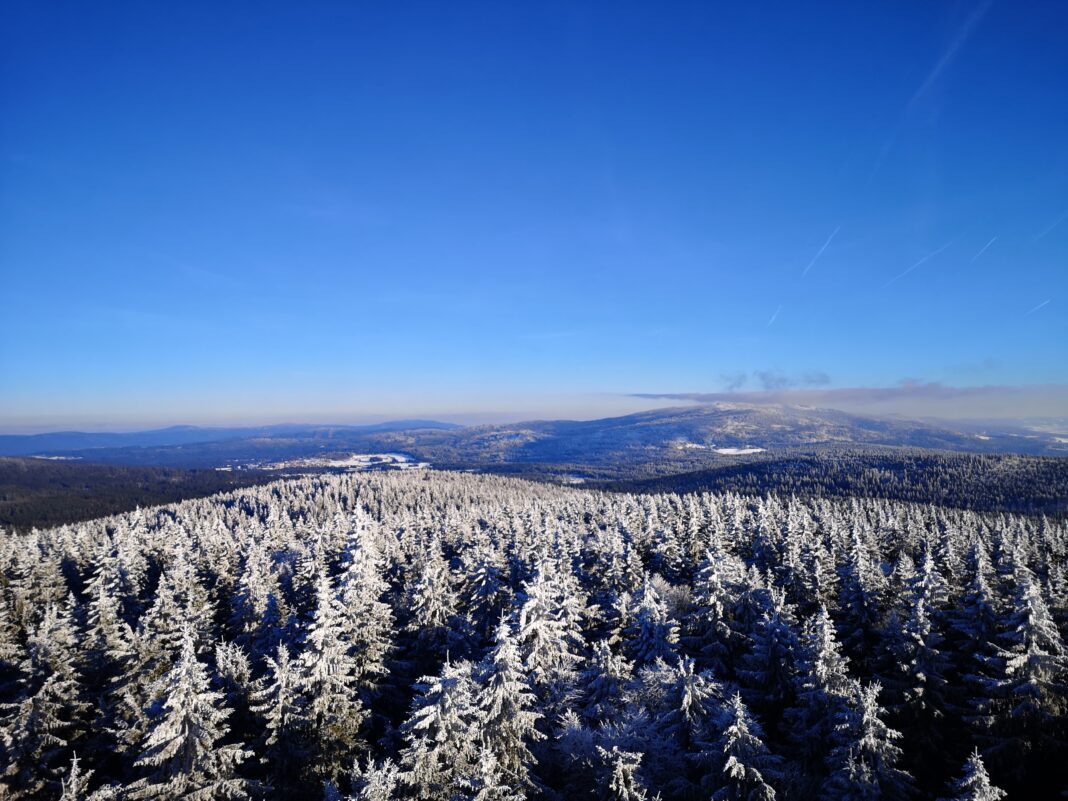 Gleich zu Beginn geht es steil bergauf, dann wechseln sich flachere und steilere Passagen immer wieder ab. An einer Kreuzung angekommen, biegen wir mit dem Winterwanderweg und dem Goldenen Steig links ab. Nach etwa einer halben Stunde erreicht man schon den Haidel und den 35 Meter hohen Aussichtsturm. Es lohnt sich, den Turm zu besteigen, denn von dort hat man einen faszinierenden Rundumblick über den Bayerischen Wald, den Böhmerwald und das Mühlviertel. An sonnigen Tagen zeichnen sich sogar die Alpen am Horizont ab. Zudem erklärt eine Panoramatafel die umliegenden Orte und Gipfel. Beim Auf- und Abstieg sollte man aber ganz besonders aufpassen, denn die Treppenstufen sind im Winter oft glatt und vereist.