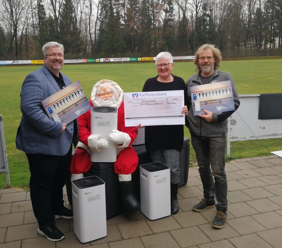 Passau. Kurz vor Weihnachten erhielt der DJK Passau-West hohen Besuch. Der Weihnachtsmann persönlich kam zusammen mit den beiden Geschäftsführern von Dentdeal Produkt & Service Frank Andrée und Armin Vormann bei der Jugendleiterin Hannelore Schneider vorbei. Im Gepäck hatten sie eine Geldspende für den Verein in Höhe von 1.000 Euro sowie zusätzlich als Geschenk vier hochwertige mobile Airdog-Luftreiniger. Die Geräte wird der DJK Passau-West in den Umkleidekabinen im Alt- und im Neubau aufstellen, wo sie die Sportler vor einer Ansteckung mit Corona-, Grippe- oder anderen Viren schützen sollen.