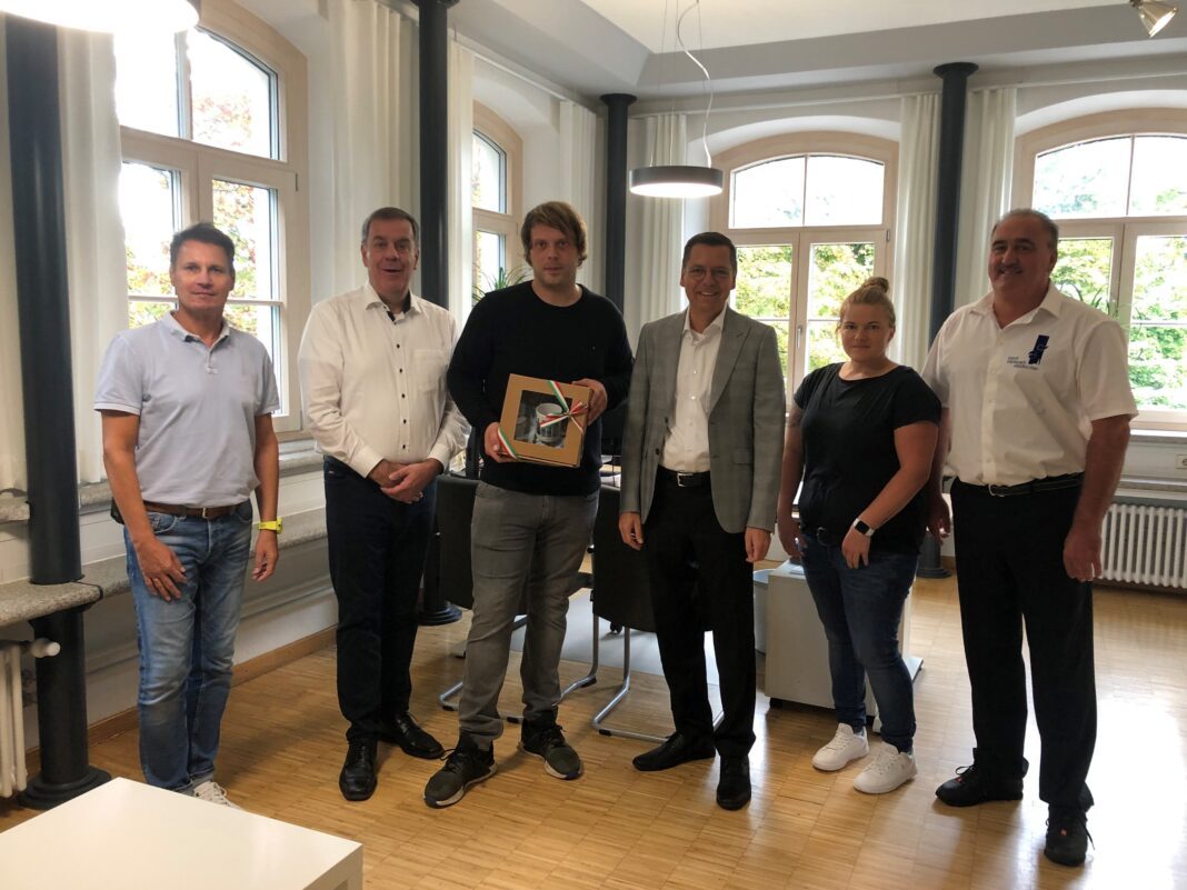 Bürgermeister Heinz Pollak, Geschäftsleiter Edaurd Wilhelm, Stadtwerkeleiter Günter Scheibenzuber, Personalratsvorsitzende Sabrina Stadler sowie Bäderparkleiter Kurt Auer wünschen dem neuen Mitarbeiter alles Gute und viel Spaß und Erfolg.