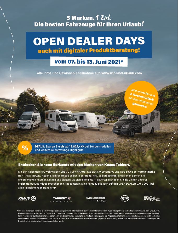 Mit KNAUS, TABBERT, WEINSBERG, T@B und der Vermietmarke RENT AND TRAVEL nehmen fünf Marken unter dem Dach von Knaus Tabbert an dieser groß angelegten Offensive teil. „Wir sind Urlaub“ steht dabei als Versprechen für einen freien, selbstbestimmten und sicheren Urlaub – Begriffe, die im Jahr 2021 wichtiger sind und höher bewertet werden denn je zuvor. Mit der zeitlichen Platzierung im Mai 2021 gelingt Knaus Tabbert zudem eine Punktlandung: Während die Impfkampagne in vielen Regionen an Fahrt gewinnt und Reisen zu immer mehr Zielen wieder möglich werden, wächst die Lust auf Caravaning in der Bevölkerung nochmals spürbar an. Genau in diesem Moment sendet Knaus Tabbert mit eindrucksvoller Präsenz auf allen Kanälen. Und falls Corona-bedingt die OPEN DEALER DAYS in einzelnen Ländern oder Regionen ausfallen sollten, wird Knaus Tabbert flexibel darauf eingehen.