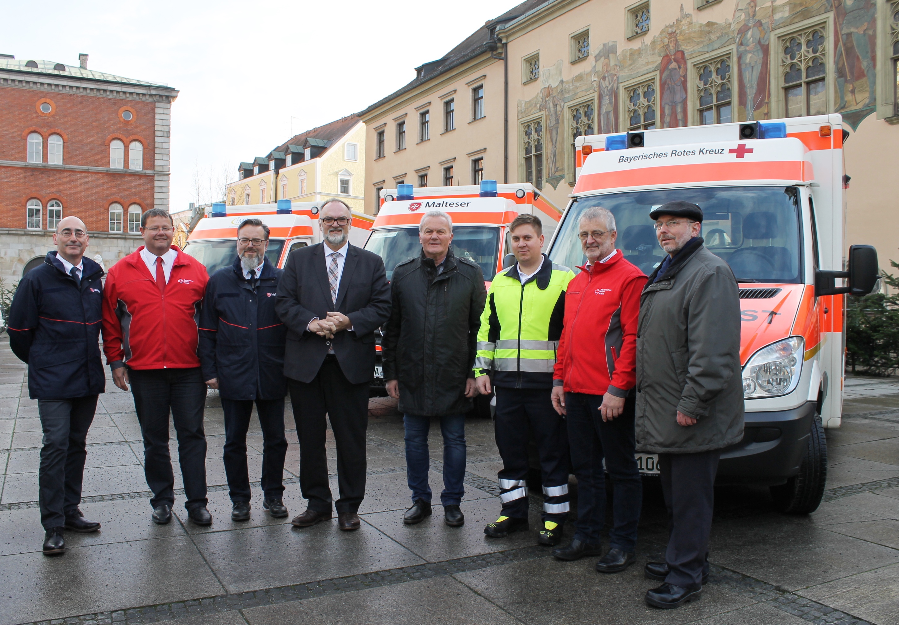 Mit dem Betrieb dieser Rettungswagen wurden das Bayerische Rote Kreuz (BRK), die Malteser Rettungsdienst gGmbH (MHD) und die IMS Rettungsdienst GmbH beauftragt. Die Verantwortlichen fuhren kürzlich mit ihren Fahrzeugen am Rathausplatz in Passau vor, um sich beim Verbandsvorsitzenden, Oberbürgermeister Jürgen Dupper, vorzustellen.