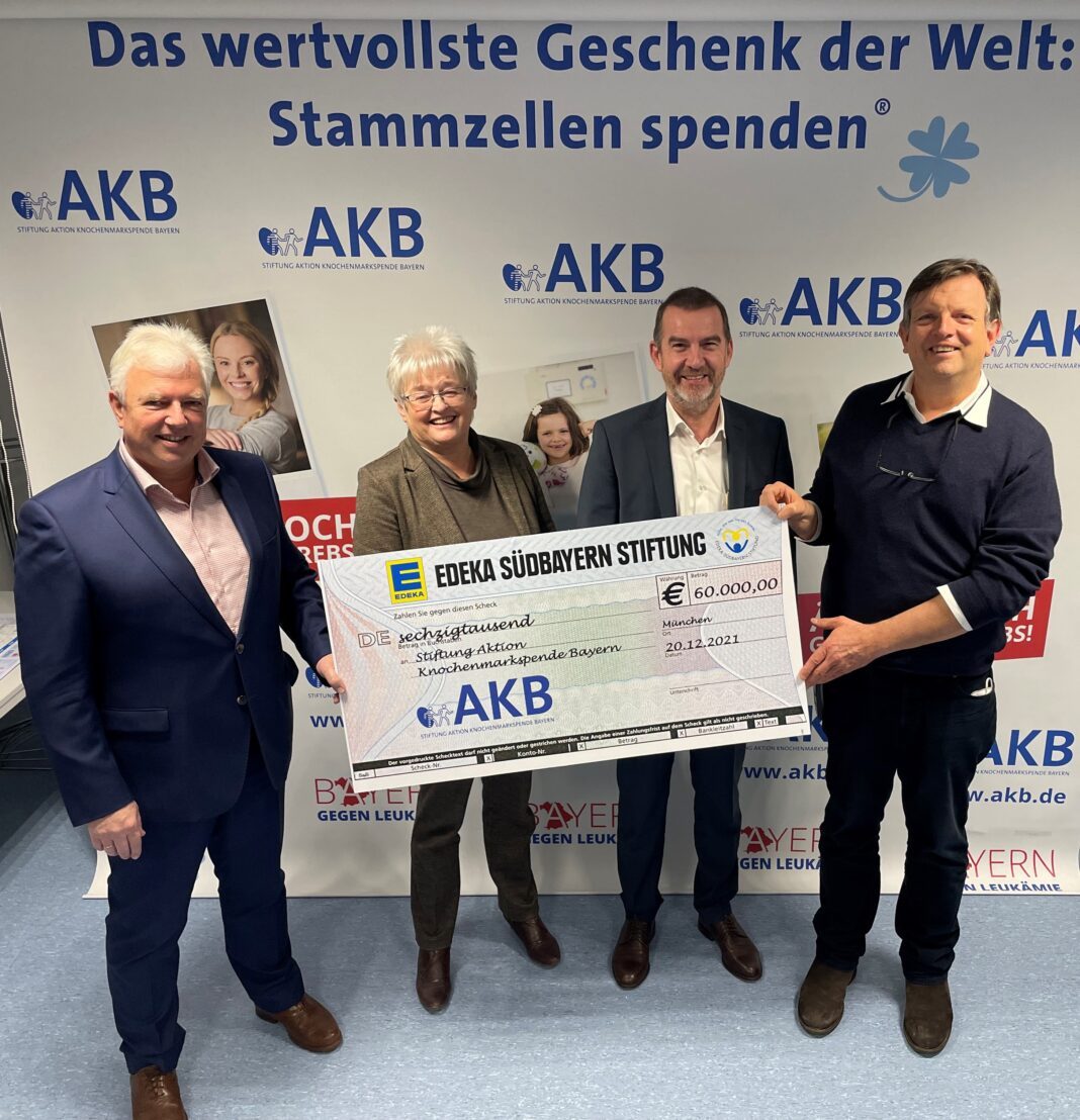 Gaimersheim. Sie sind Partner im Kampf gegen eine tückische Krankheit: Leukämie. Im dritten Jahr in Folge spendet die gemeinnützige EDEKA Südbayern Stiftung einen hohen Geldbetrag an die Stiftung Aktion Knochenmarkspende Bayern (AKB). Und die Spendensumme wurde 2021 verdoppelt: Den Scheck in Höhe von diesmal 60.000 Euro (in den Vorjahren jeweils 30.000 Euro) übergaben die Stiftungsratsvorsitzende und der Vorstandsvorsitzende der EDEKA Südbayern Stiftung Annemarie Schalk und Lothar Odenbach am 20. Dezember 2021 direkt vor Ort in den Räumen der AKB in Gauting bei München.