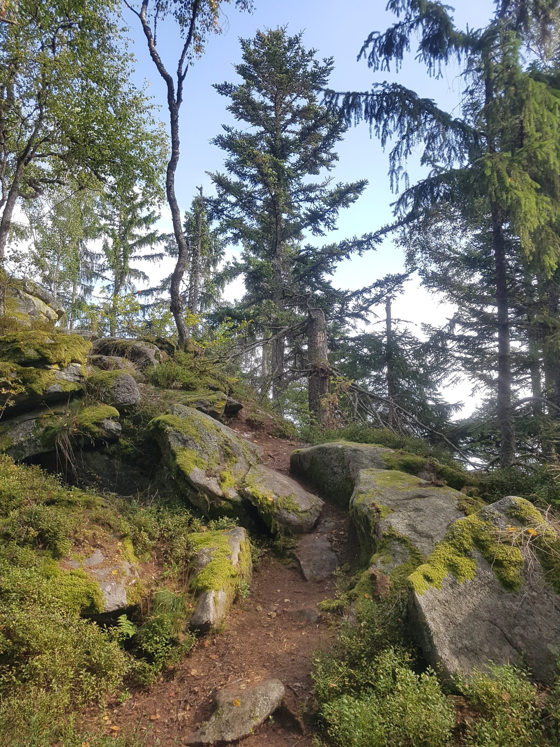 Über einen verwurzelten und steinigen Pfad durch den schattigen Fichtenwald geht es steil bergauf. Je höher man kommt, desto mystischer und unheimlicher wird es. Oben auf dem Grat angekommen, biegen wir rechts ab. Über Stock und Stein folgen wir nun auf dem Höhenzug der roten 3 bzw. der grünen 6 und bahnen uns den Weg entlang von beeindruckenden Felsen und entwurzelten Bäumen durch die schaurige Umgebung.