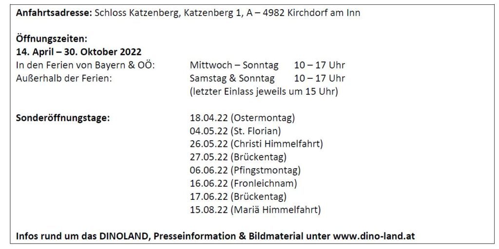 Dinoland-Fieber am 14. April 2022 auf Schloss Katzenberg im Innviertel | Tickets gibt’s ab 11. März im Vorverkauf