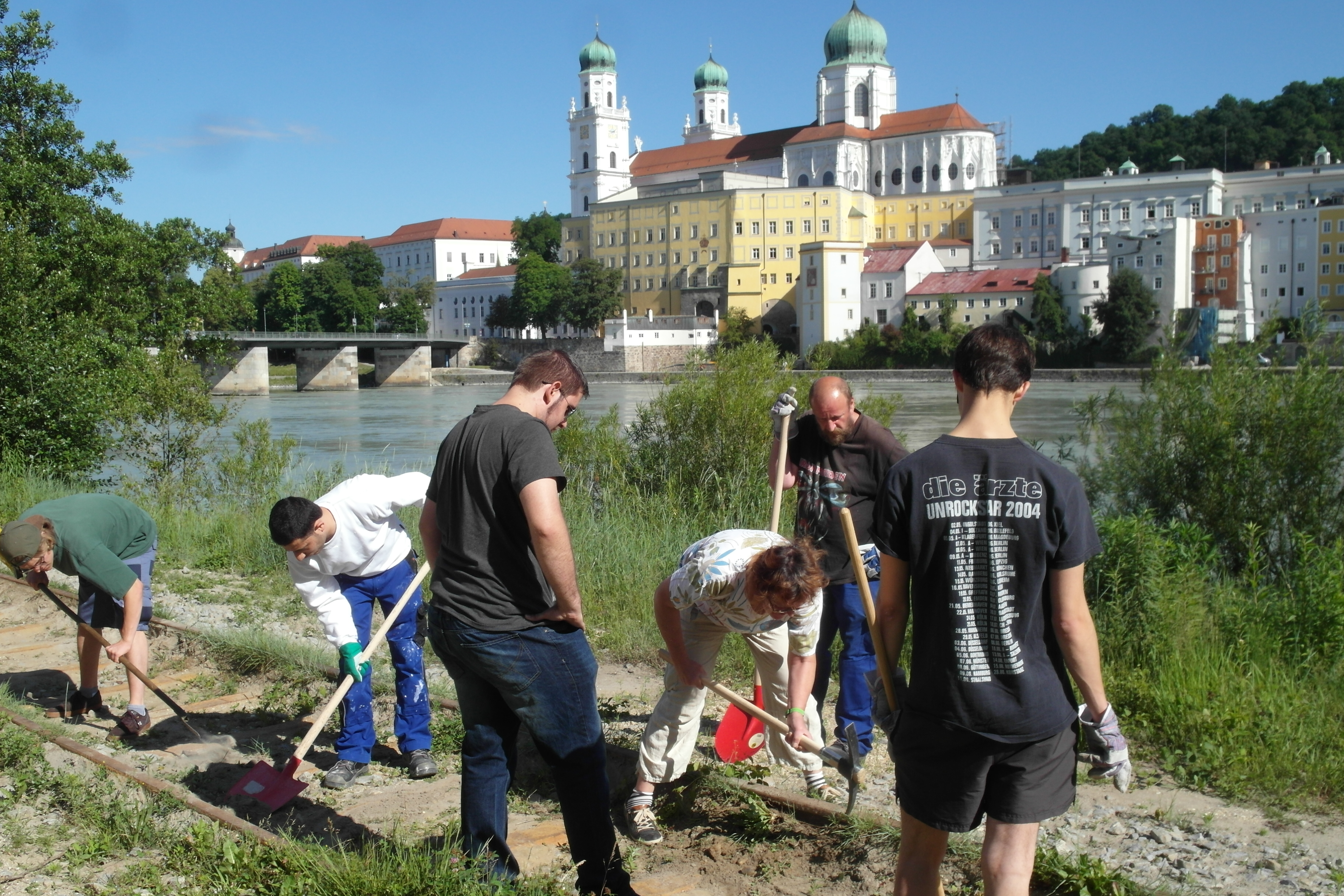 „Wie kann ich mich ehrenamtlich engagieren?“ ist die Frage, die in der Schulung „Mit Kompetenz im Ehrenamt“ beantwortet werden soll. In Kooperation mit dem bfz Passau erfahren zurzeit 13 arbeitslose Teilnehmer des ICE-Kurses mehr zum Thema Ehrenamt, was es bringen kann und wie es jemanden sowohl persönlich als auch beruflich weiterhelfen kann. „Jeder kann was tun, jeder kann dazu beitragen, das Miteinander schöner und besser zu gestalten!“ ist Perdita Wingerter, Geschäftsführerin des gemeinnützigen Vereins „Gemeinsam leben & lernen in Europa“ (GLL) überzeugt. Sie versucht zusammen mit dem Bundesfreiwilligen Yannik Stefani die Teilnehmer fürs Ehrenamt zu begeistern. Damit es nicht bei der Theorie bleibt, organisieren die Kursteilnehmer eigene ehrenamtliche Aktionen. Herbert Schwarz, einer der Teilnehmer, schlug vor „was Praktisches draußen zu tun“. Und praktische Hilfe und anpackende Hände kann der Förderverein für die Granitbahnstrecke Hauzenberg-Passau gebrauchen. „Wir müssen die Bahnstrecke in der Innstadt im Bereich Voglau bis hin zur Kräutelsteinbrücke freischneiden. Auch die Schraubenköpfe an den Schwellen müssen von der Erde befreit werden, die seit dem Hochwasser alles bedeckt hatte.“, erzählt Heidi Bauer, Vorsitzende der Lokalbahn. Und so packten die Teilnehmer und Kursleiter sowie Max Barnewitz, Freiwilliger bei GLL, tatkräftig an und räumten ca. 30 Meter der Bahnstrecke frei. Die Arbeit war zwar anstrengend, aber am Ende blickten alle Teilnehmer zufrieden auf die freigelegte Bahnstrecke. „Das ist viel befriedigender als in der Werkstatt stundenlang an einem Stück zu feilen!“ fasst Herbert Schwarz die Aktion zusammen. Auch deshalb will er dabeibleiben und tauschte mit Ehrenamtlichen der Lokalbahn Telefonnummern aus. „Wir sind über jede Hilfe dankbar, schließlich gibt es noch viel zu tun, bis die Strecke freigeräumt ist.“, sagt Heidi Bauer. „Wer Lust hat mitzumachen kann einfach Freitagnachmittag oder Samstag in die Innstadt an die Gleise vorbeikommen, da sind immer Ehrenamtliche von uns aktiv. Wir können jede Hand gebrauchen!“