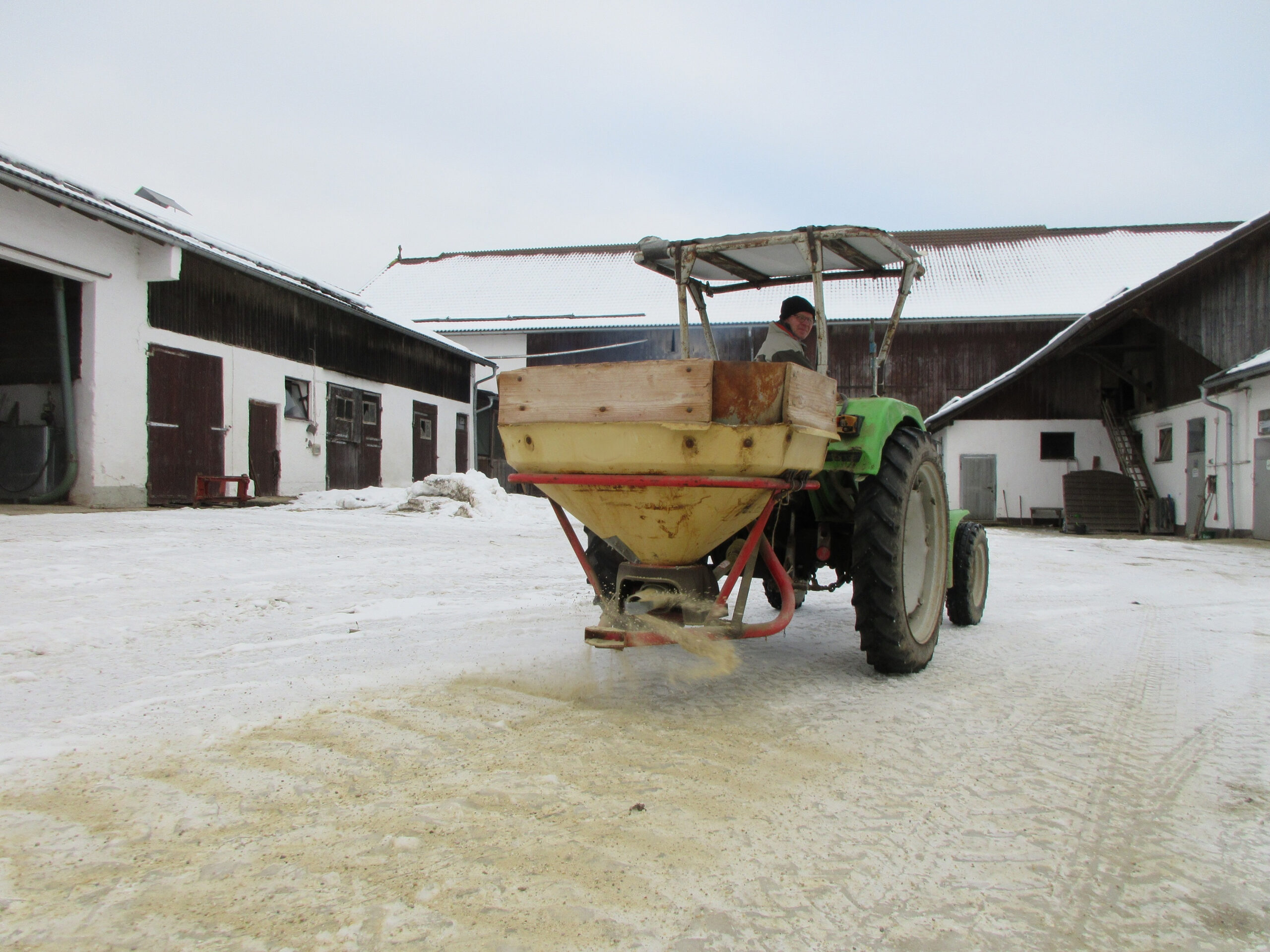 Streuen Sie immer wieder nach, wenn das Streumaterial sich verbraucht. Damit vermeiden Sie, dass Sie und Ihre Lieben stürzen und sich verletzen. Sie sind für die Gesundheit aller, die auf Ihrem Hof mitarbeiten, verantwortlich.