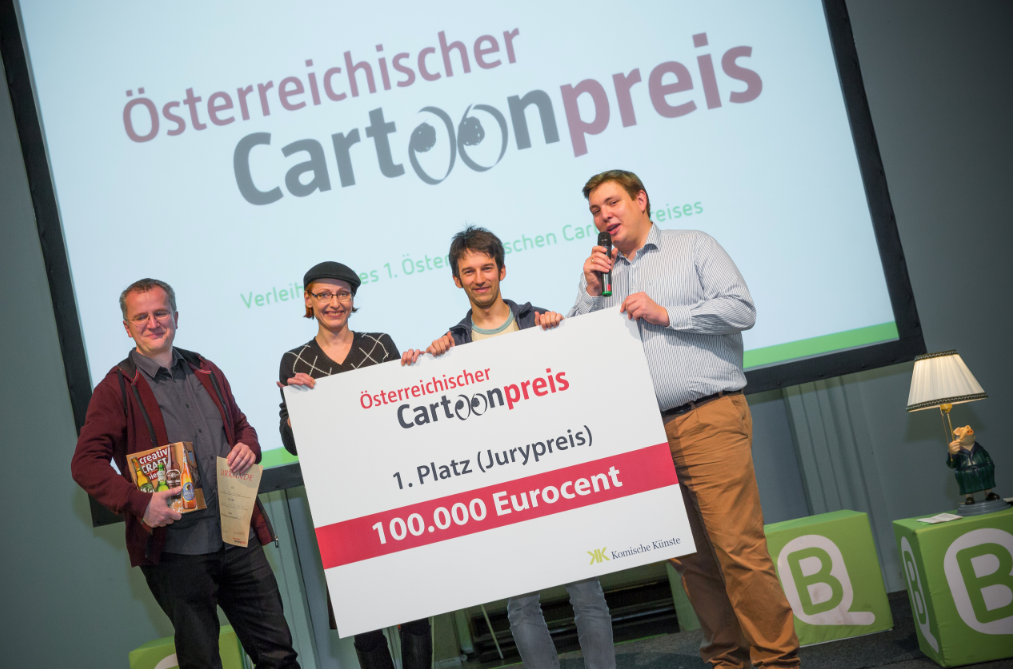 Bisher gab es in Österreich keinen eigenen Preis für Cartoonisten. Das zu ändern haben sich die KOMISCHEN KÜNSTE zur Aufgabe gemacht und deshalb diesen Preis ins Leben gerufen; vor allem aber wollten sie endlich einmal einen monströsen Scheck überreichen.