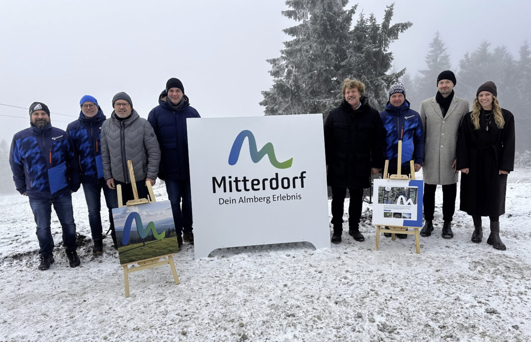 „Zu diesem umfassenden Neustart gehört auch ein zeitgemäßes Erscheinungsbild – vom Logo über die Marketingstrategie bis hin zum gesamten ‘Look and Feel’“, erklärte Gruber, bevor er gemeinsam mit Grafikdesigner Willi Weber und Marketingexperte Rainer Jungwirth (Agentur siimple, Freyung) das neue Logo vor Medienvertretern enthüllte. Jungwirth erläuterte anschließend die Gedanken hinter dem Design und dem Claim „Mitterdorf – Dein Almberg Erlebnis“.