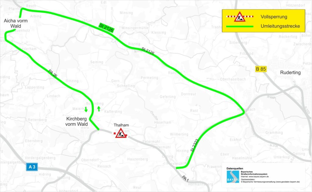 Während der Sperrzeit wird der Verkehr in Richtung Kirchberg v. Wald ab der Kreuzung St 2323/PA1 umgeleitet in Richtung Haselbach. Auf der St 2126 führt die Umleitung in Richtung Aicha v. Wald und weiter ab der Kreuzung mit der PA 26 nach Kirchberg v. Wald. In der Gegenrichtung verläuft die Umleitung des Verkehrs entsprechend in umgekehrter Reihenfolge. Die Umleitungsstrecken sind ausgeschildert.
