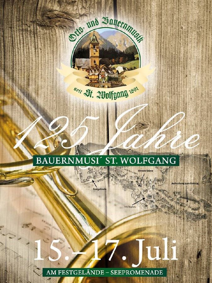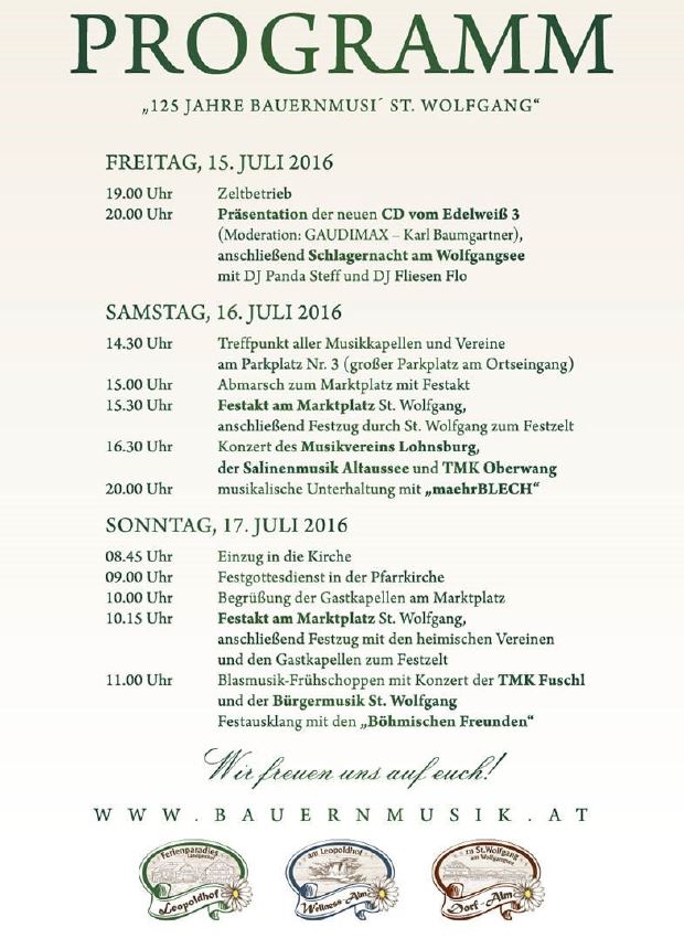 Nunmehr lädt die Orts- und Bauernmusik zum nächsten großen Jubiläum, der 125 Jahr Feier. Ein beeindruckendes Jubiläum, zu dem an der Seepromenade in St.Wolfgang ein Festzelt aufgebaut wird. Das 3-tägige Programm startet am Freitag, 15. Juli Abend mit der Präsentation der neuen CD Edelweiß 3 sowie einer Schlagernacht mit DJ´s Panda Steff und Fliesen Flo. Am Samstag- wie könne es anders sein bei einem derartigen Jubiläum – erfolgt ein Festumzug mit zahlreichen Gastmusikkapellen – Start um 15.30 Uhr am Marktplatz St.Wolfgang. Der Festumzug endet im Festzelt – und hier spielen der Musikverein Lohnsburg, die Salinenmusik Altaussee sowie die Musikkapelle Oberwang. Anschließend unterhält die Blasmusikpartie„maehrBlech“.