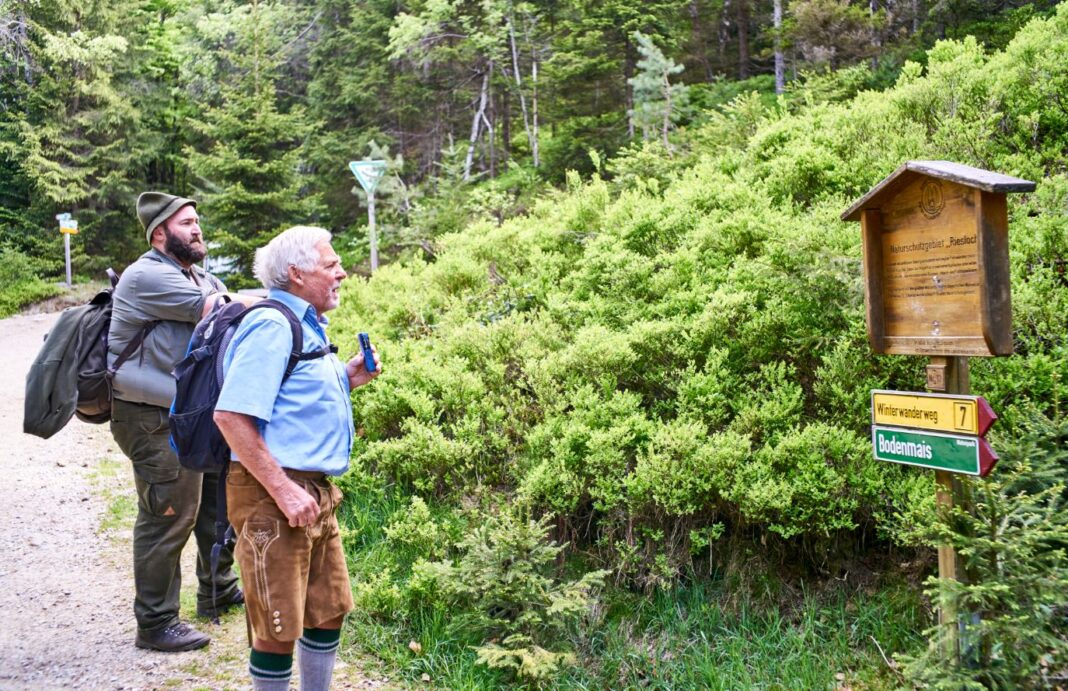 Es sei ein Zufall gewesen, von diesem herrlichen Ort zu erfahren, erklärte der joviale Georg Kirner bei seiner Ankunft in Bodenmais. Bei einer Veranstaltung am Tegernsee bekam er den Tipp, doch einmal das Rißloch vorzustellen, jenes traumhafte Naturschutzgebiet, das jeder Besucher des Bayerischen Waldes gesehen haben sollte. Gesagt, getan. Für seine Reihe in der Heimatsendung „Wir in Bayern“ testete er die zweistündige Wanderung rund um den Rißbach und ließ sich dabei von Wolfgang „Woife“ Schreil in die Geheimnisse um den Bodenmaiser Bergwald einweihen. Eifrig machte er Notizen und sammelte alle relevanten Daten, die interessierte Wanderer für einen Besuch im beliebtesten
