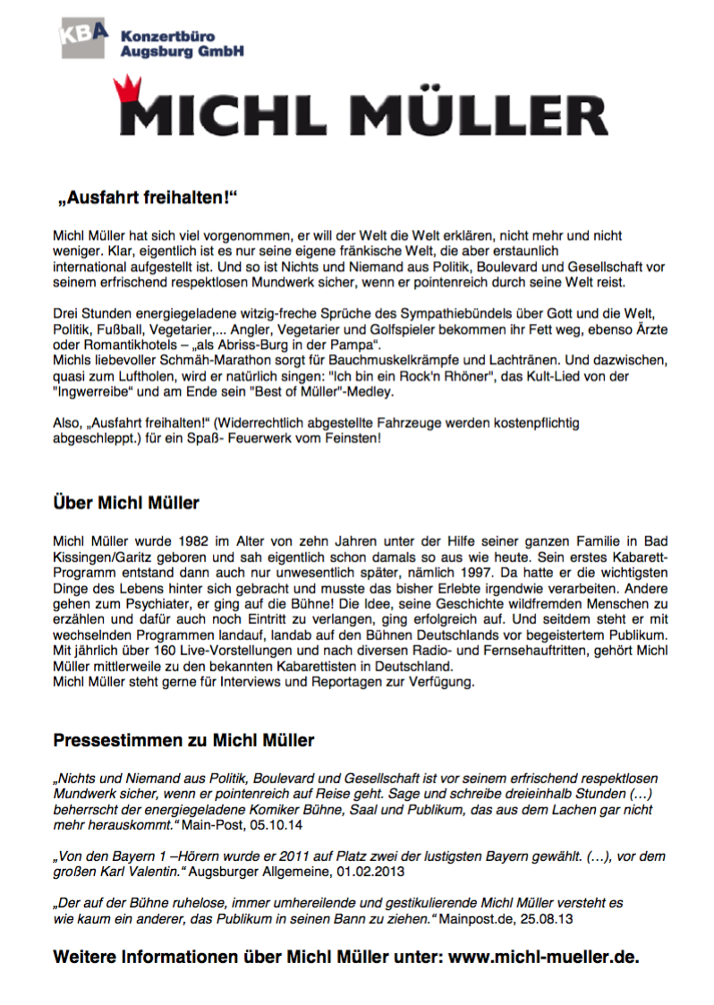 Michl Müller – „Kind“ und DAS Highlight der „Fastnacht in Franken“ und der „närrischen Weinprobe“ gehört mit jährlich über 200 Live-Shows mittlerweile zu den bekanntesten Kabarettisten aus Franken – nun sogar mit eigener Sendung: „Drei. Zwo. Eins. Michl Müller“! Neue Folgen gibt es derzeit in der ARD / BR. Seiner ohnehin schon rasant wachsenden Fan-Gemeinde hat das über die Bayerischen Landesgrenzen hinaus noch ordentlich Zulauf beschert.