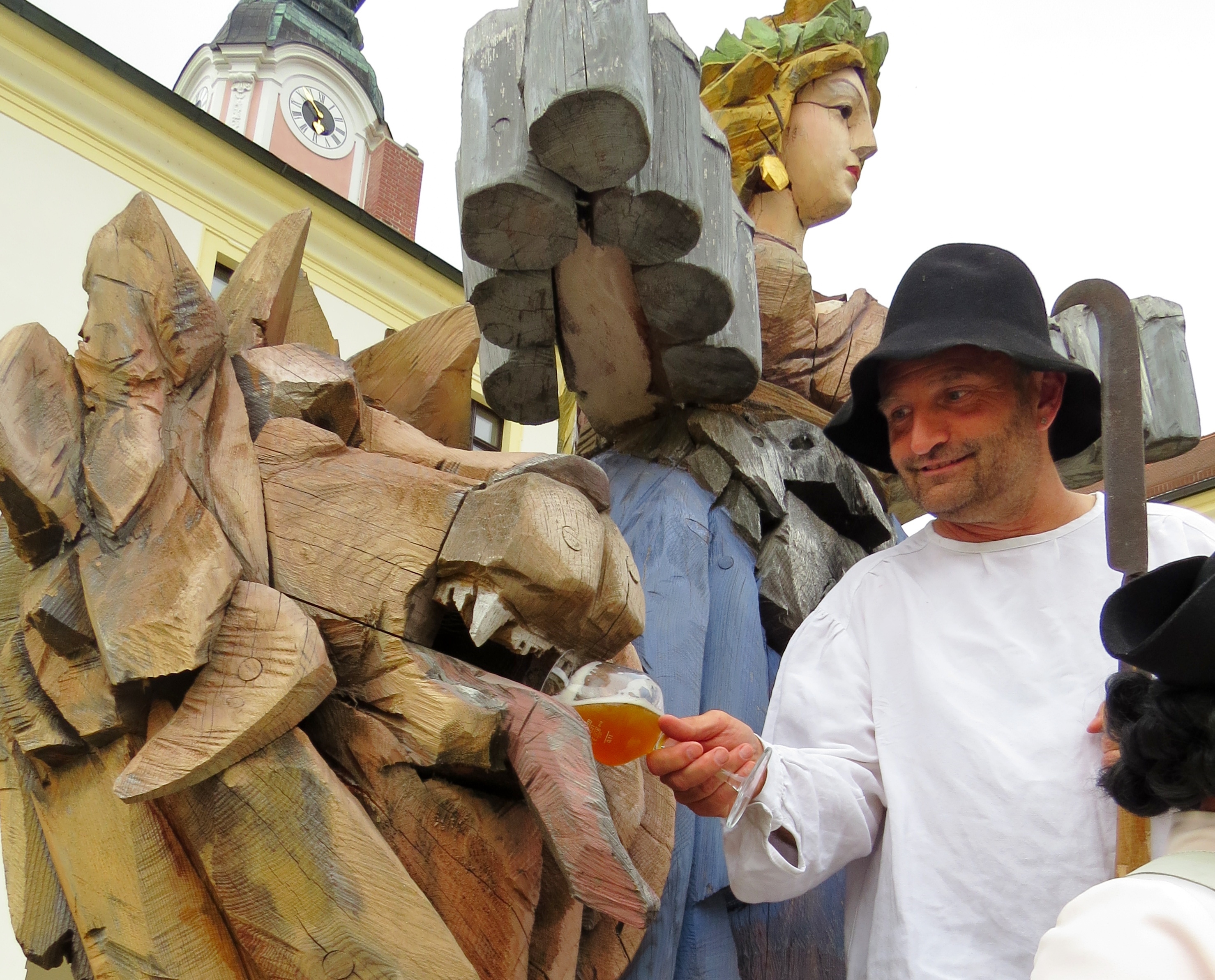 Auch der königlich-bayerische Löwe der zur Landesausstellung „Bier in Bayern“ geschnitzten Bavaria vor dem Aldersbacher Bräustüberl durfte nicht zu kurz kommen und das für das Freilichtspiel „Aiden-bach 1706“ selbstgebraute und exklusiv im Freilichtspiel erhältliche „Revoluzzer“-Bier verkosten (Foto: Sebastian Höng)