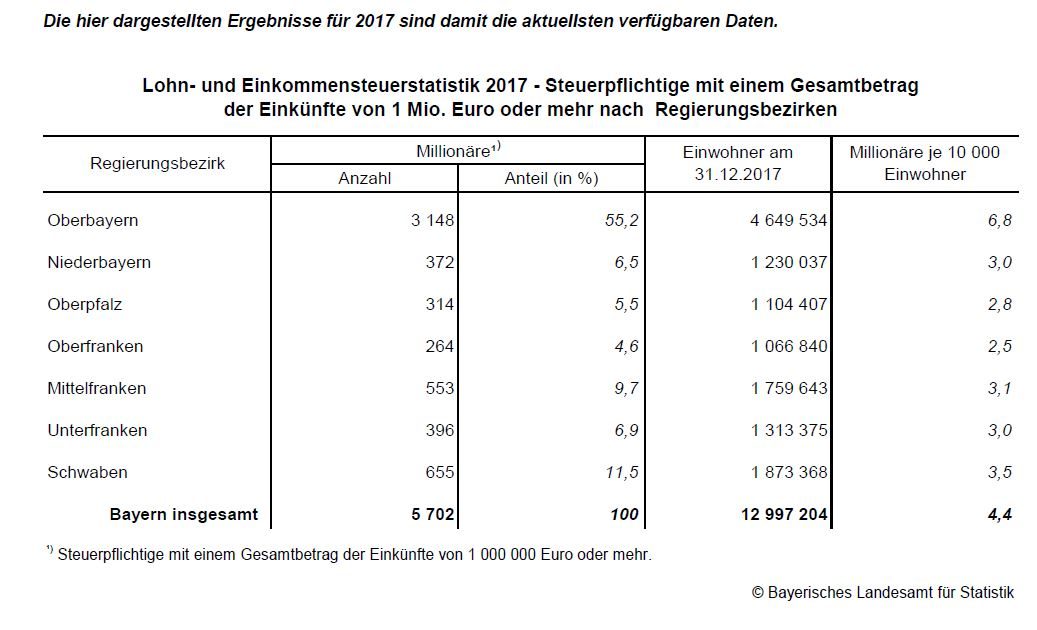 Insgesamt kamen im Jahr 2017 in Bayern im Durchschnitt 4,4 Einkommensmillionäre auf 10 000 Einwohner. Im Jahr 2016 waren es 4,1. Die höchste Millionärsdichte gab es im Landkreis Starnberg mit 20,4 Einkommensmillionären je 10 000 Wohner. Es folgten der Landkreis München mit 12,4, der Landkreis Miesbach mit 11,1, die kreisfreie Stadt Memmingen mit 9,7 und die Stadt München mit 9,5 Einkommensmillionären je 10 000 Einwohner.