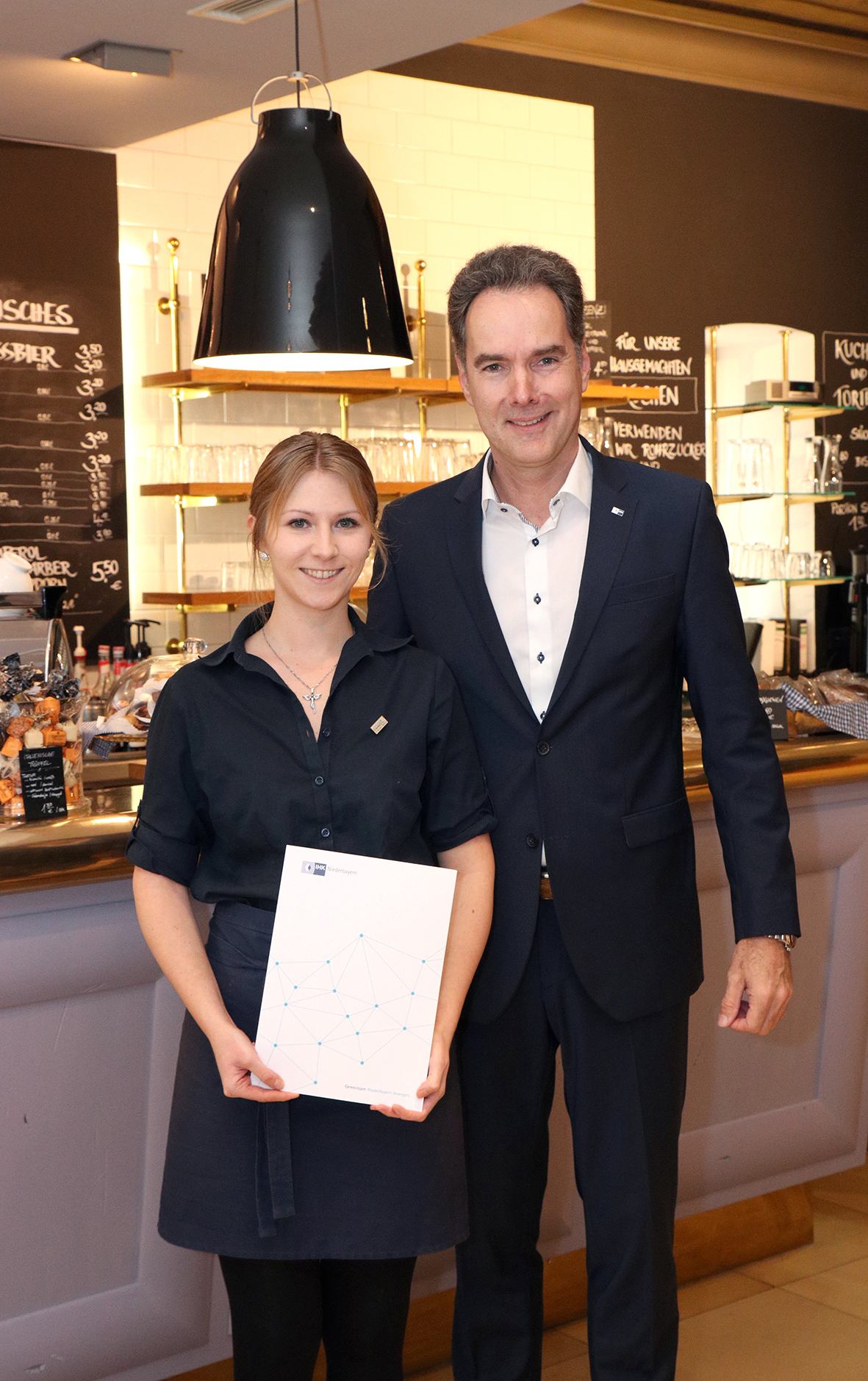 Sozusagen den umgekehrten Weg ist hingegen Nadine Heissig gegangen, die Bundesbeste der Fachleute für Systemgastronomie. Sie hatte zunächst an der Universität Passau Jura studiert, aber nebenbei immer wieder im Passauer Café Amsl gejobbt, das damals noch unter dem Namen Aran lief. Nach dem ersten Staatsexamen entschied sie sich aber, aus der Nebentätigkeit einen Beruf und eine Berufung werden zu lassen – zu viel Spaß machte ihr die Arbeit, zu sehr schätzte sie den Kontakt mit den Menschen. Die Ausbildung durchlief sie verkürzt, in Rekordzeit und mit Top-Noten, gekrönt nun mit dem bundesbesten Abschluss. Sie ist damit die beste Absolventin unter 1.300 Azubis in ihrem Beruf bundesweit.